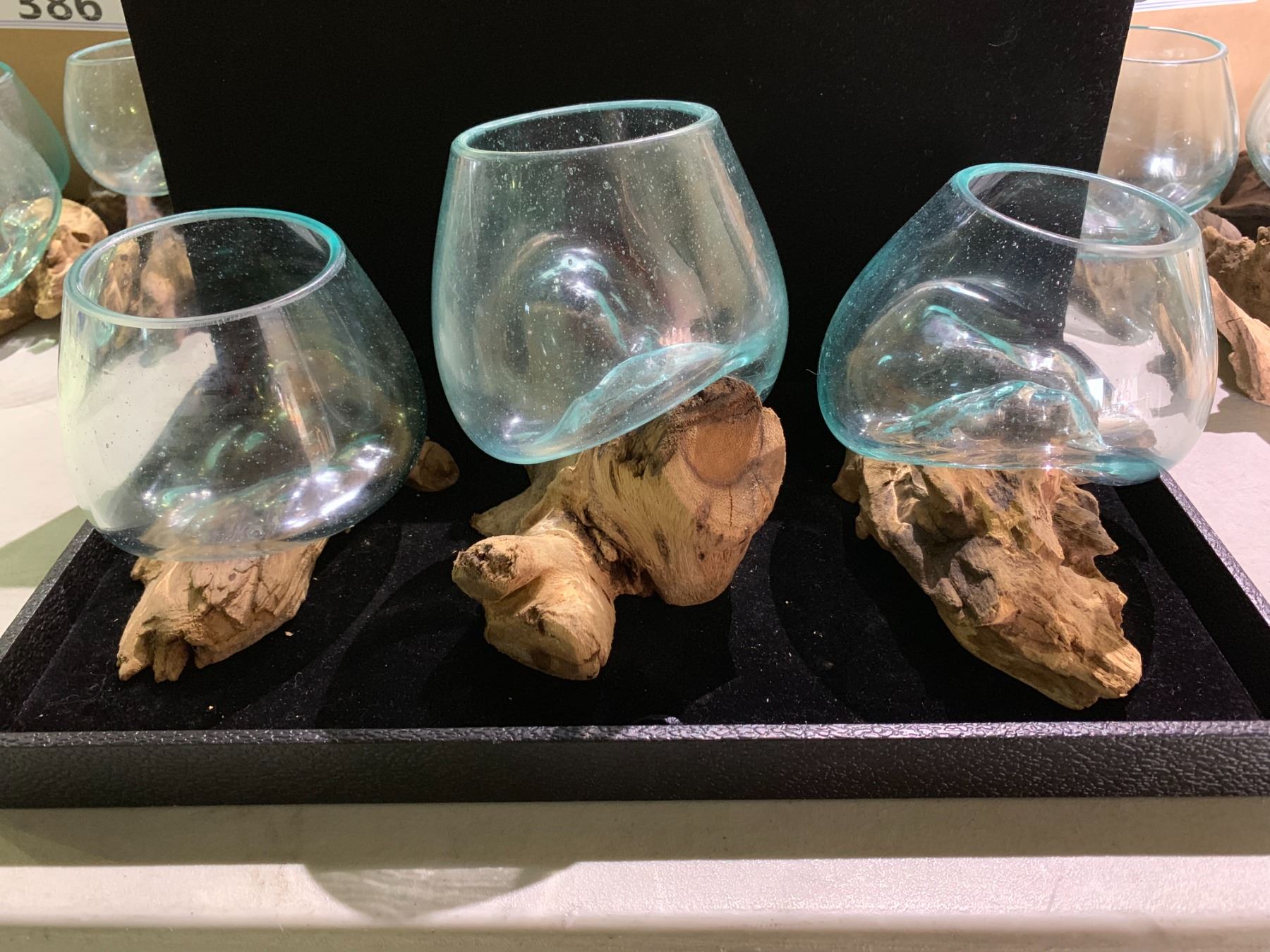 3 HAND MADE MOLTEN GLASS BOWLS ON TEAK BASES
