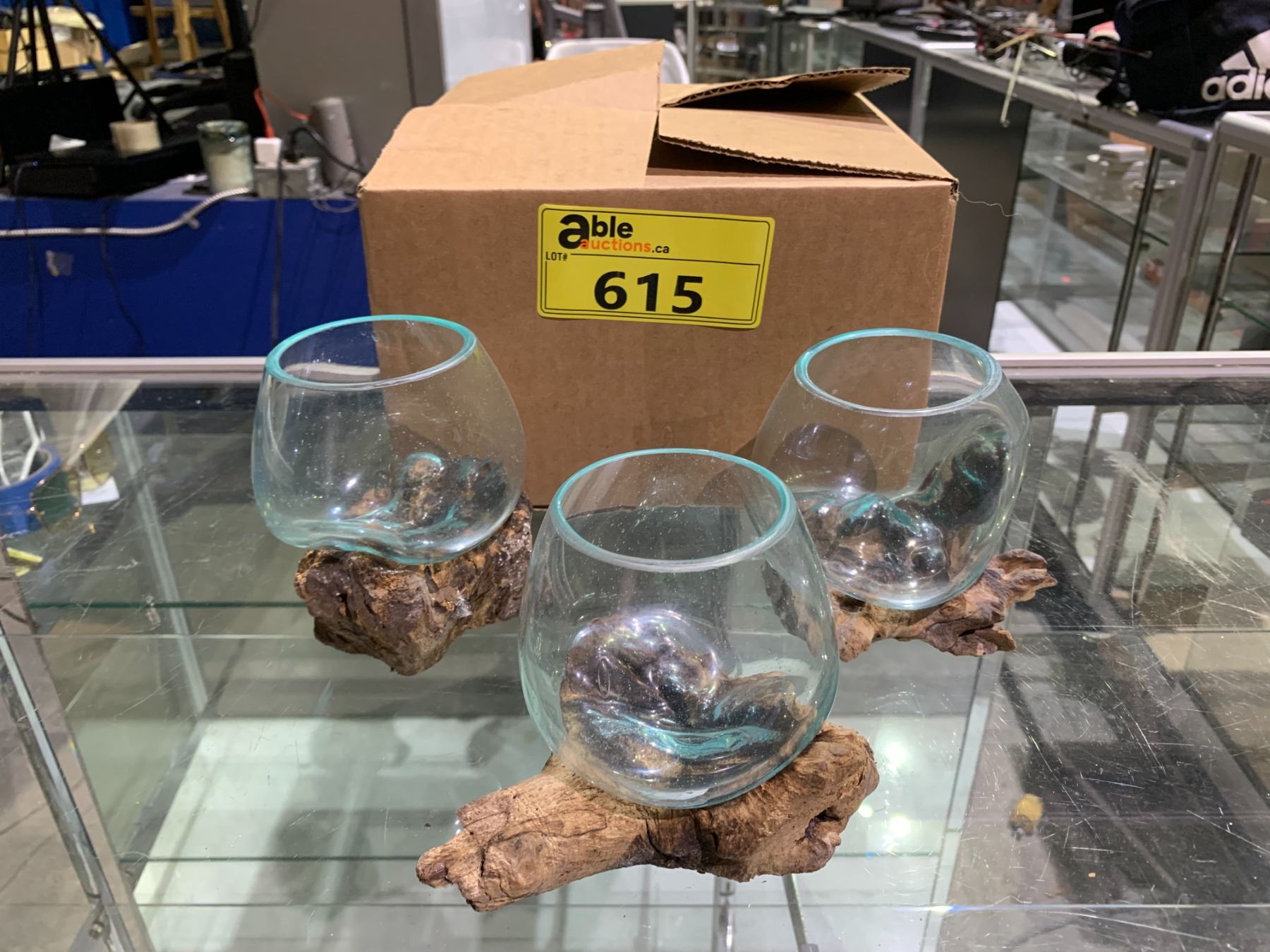 3 HAND MADE MOLTEN GLASS BOWLS ON TEAK BASES