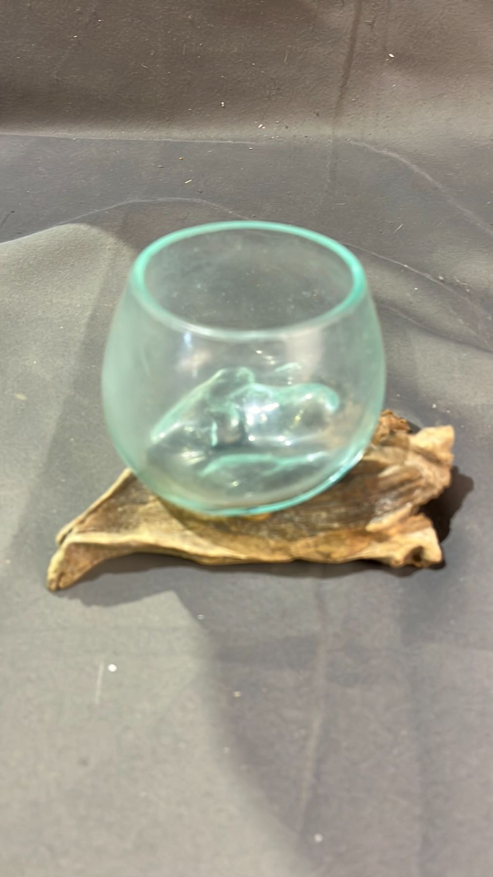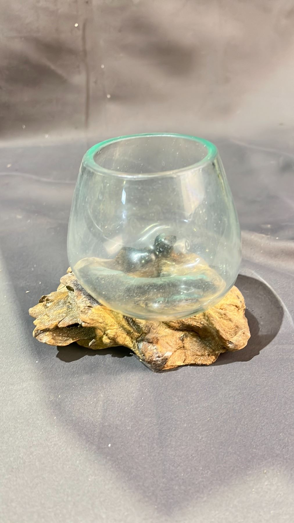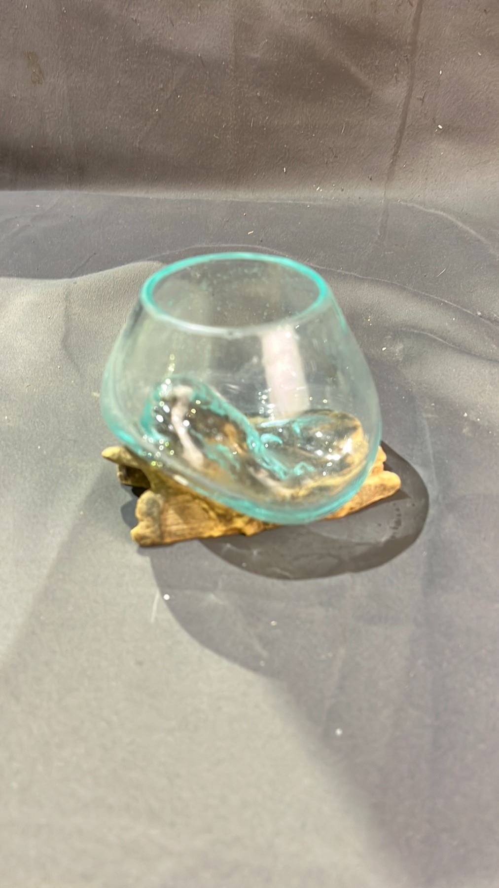 3- HAND MADE MOLTEN GLASS BOWLS ON TEAK BASES