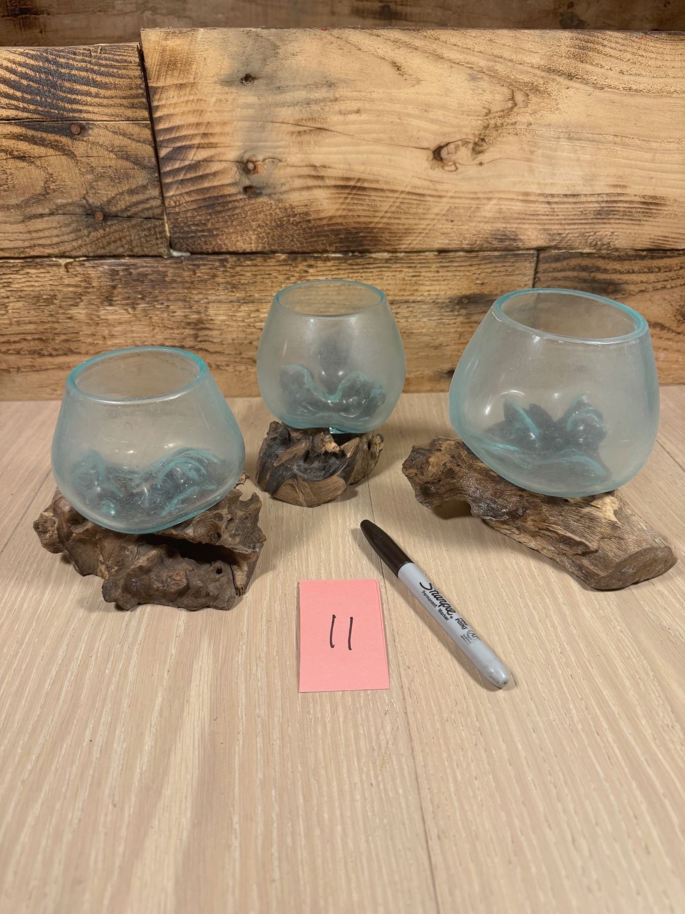 3- HAND MADE MOLTEN GLASS BOWLS ON TEAK BASES