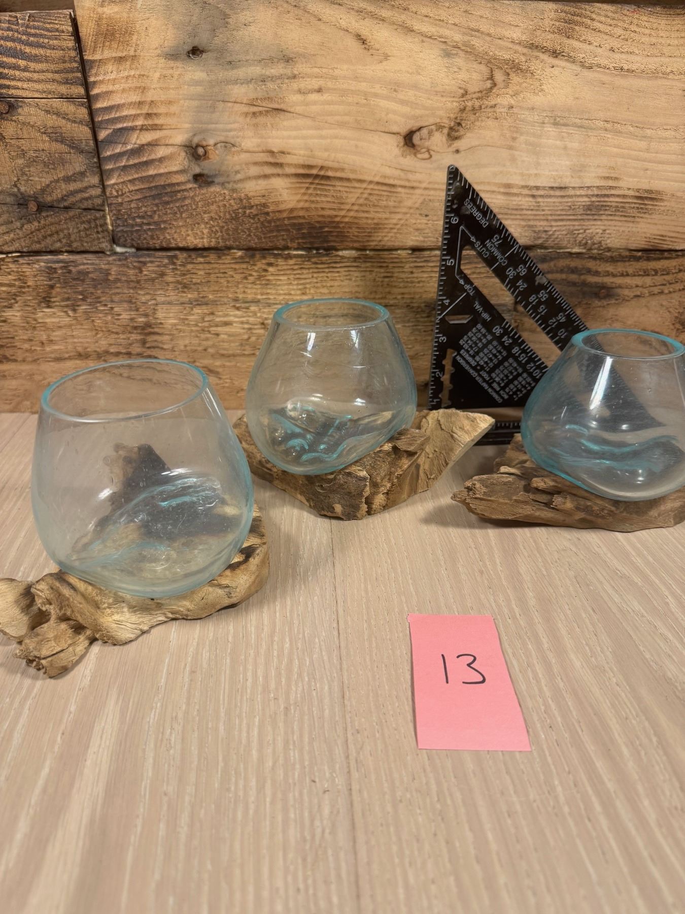 3- HAND MADE MOLTEN GLASS BOWLS ON TEAK BASES