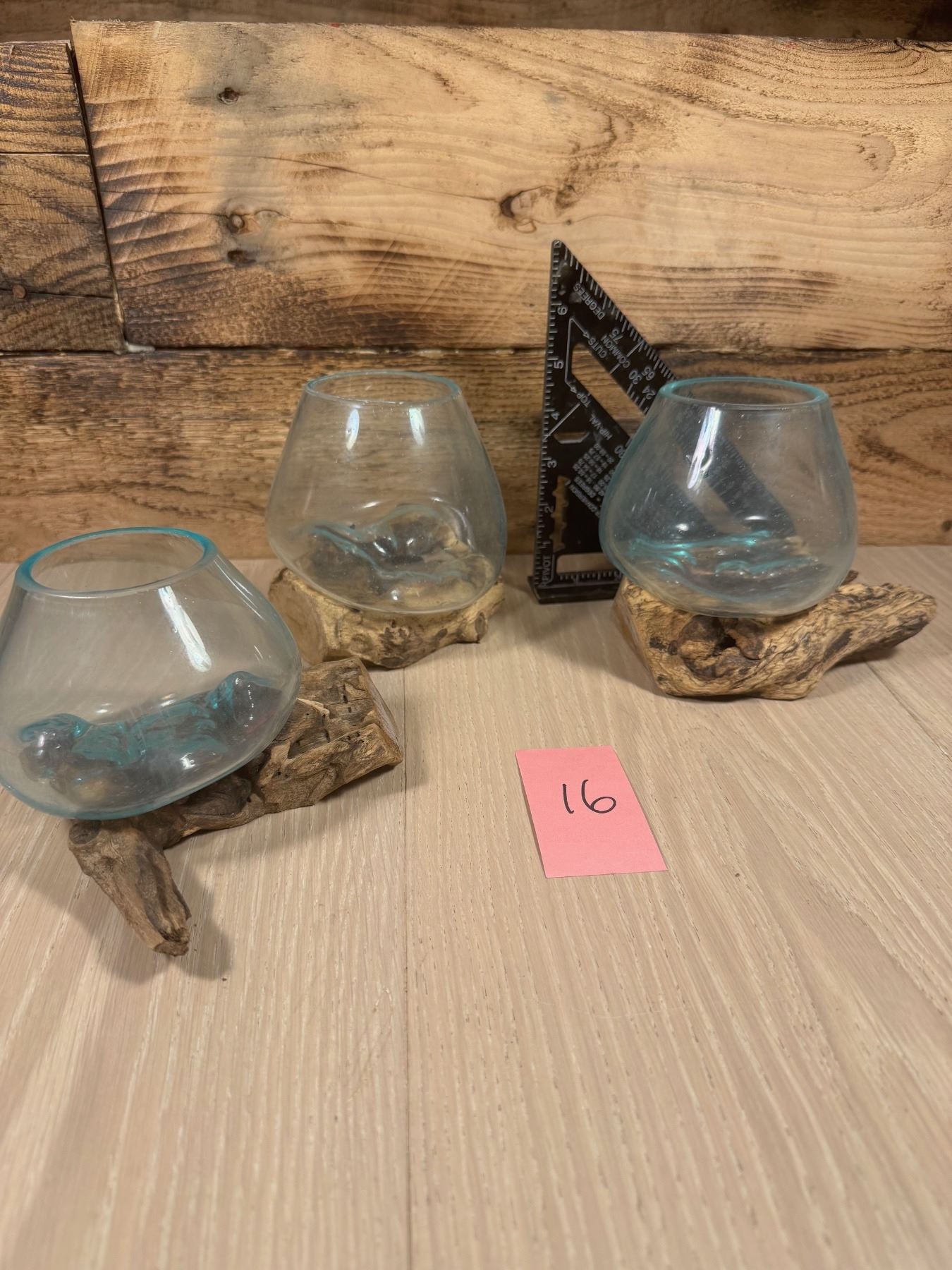 3- HAND MADE MOLTEN GLASS BOWLS ON TEAK BASES