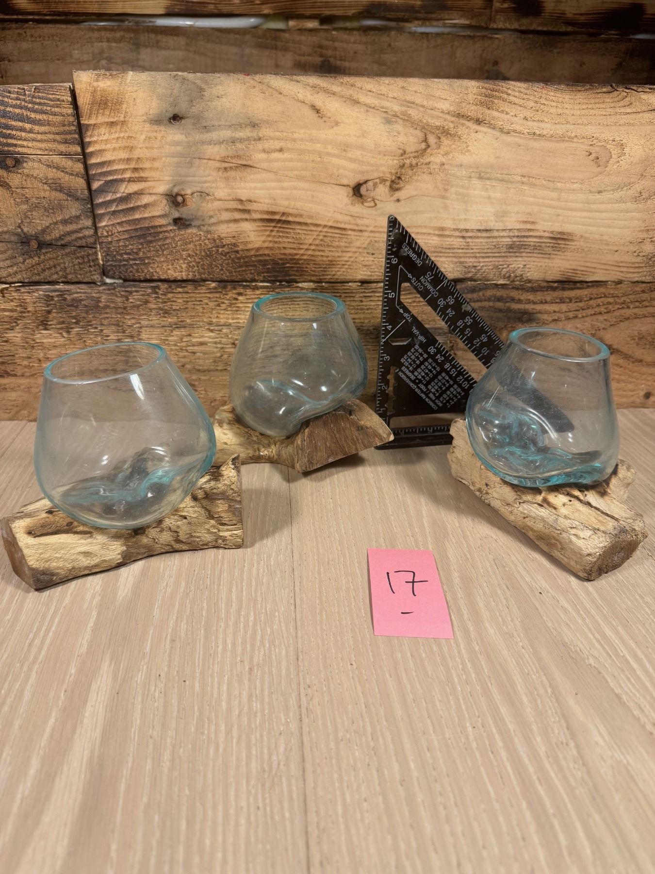 3- HAND MADE MOLTEN GLASS BOWLS ON TEAK BASES