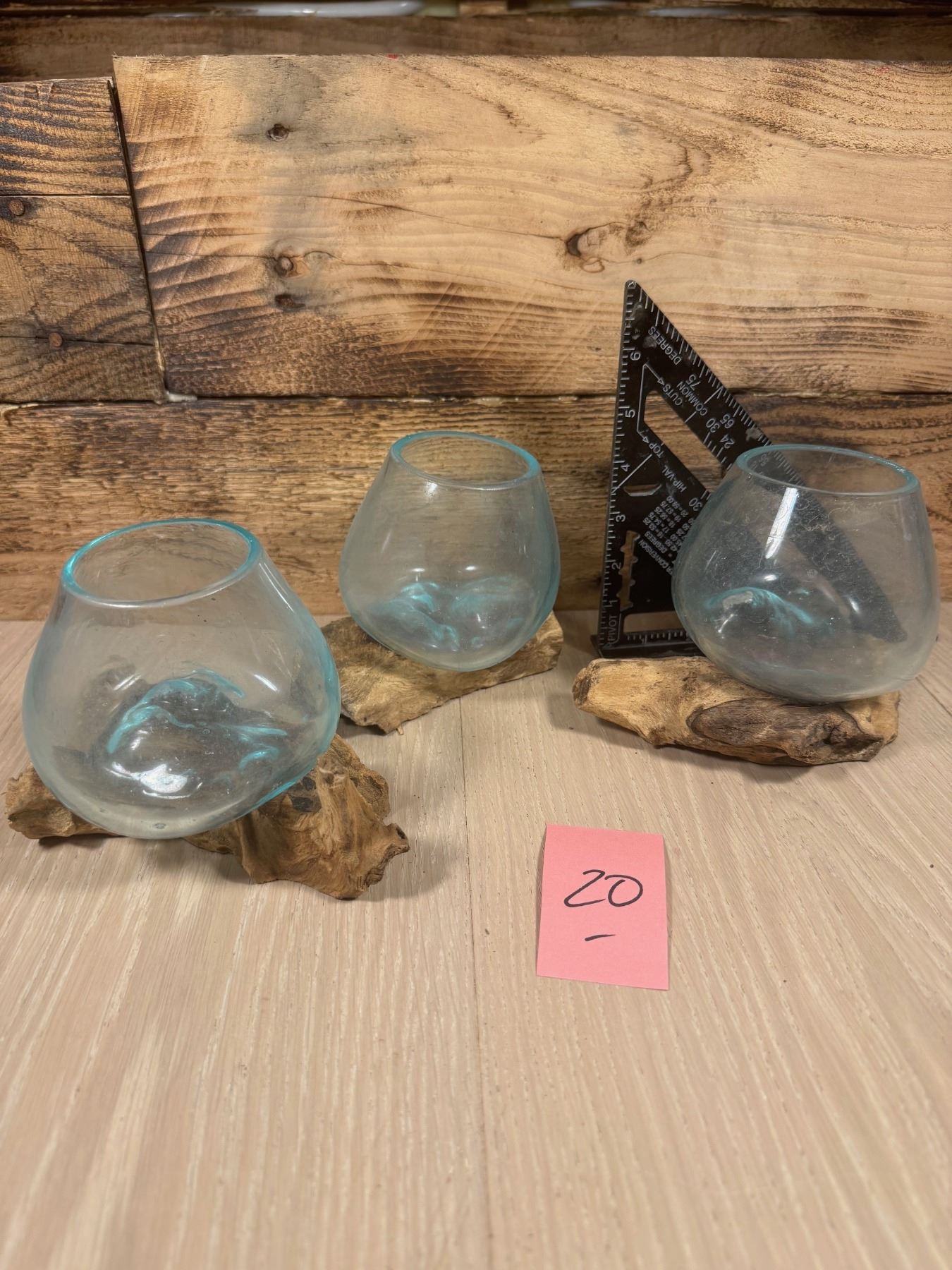 3- HAND MADE MOLTEN GLASS BOWLS ON TEAK BASES