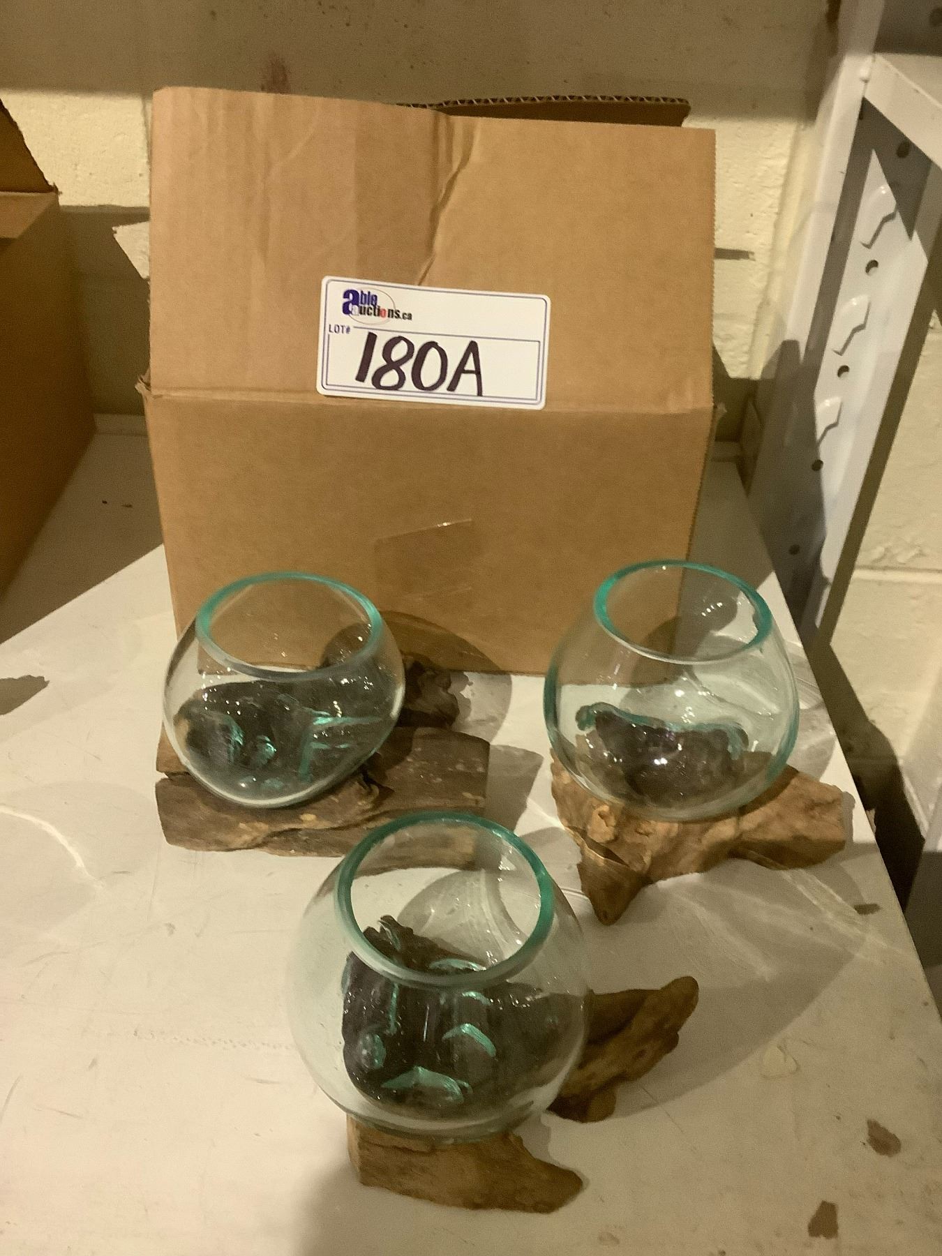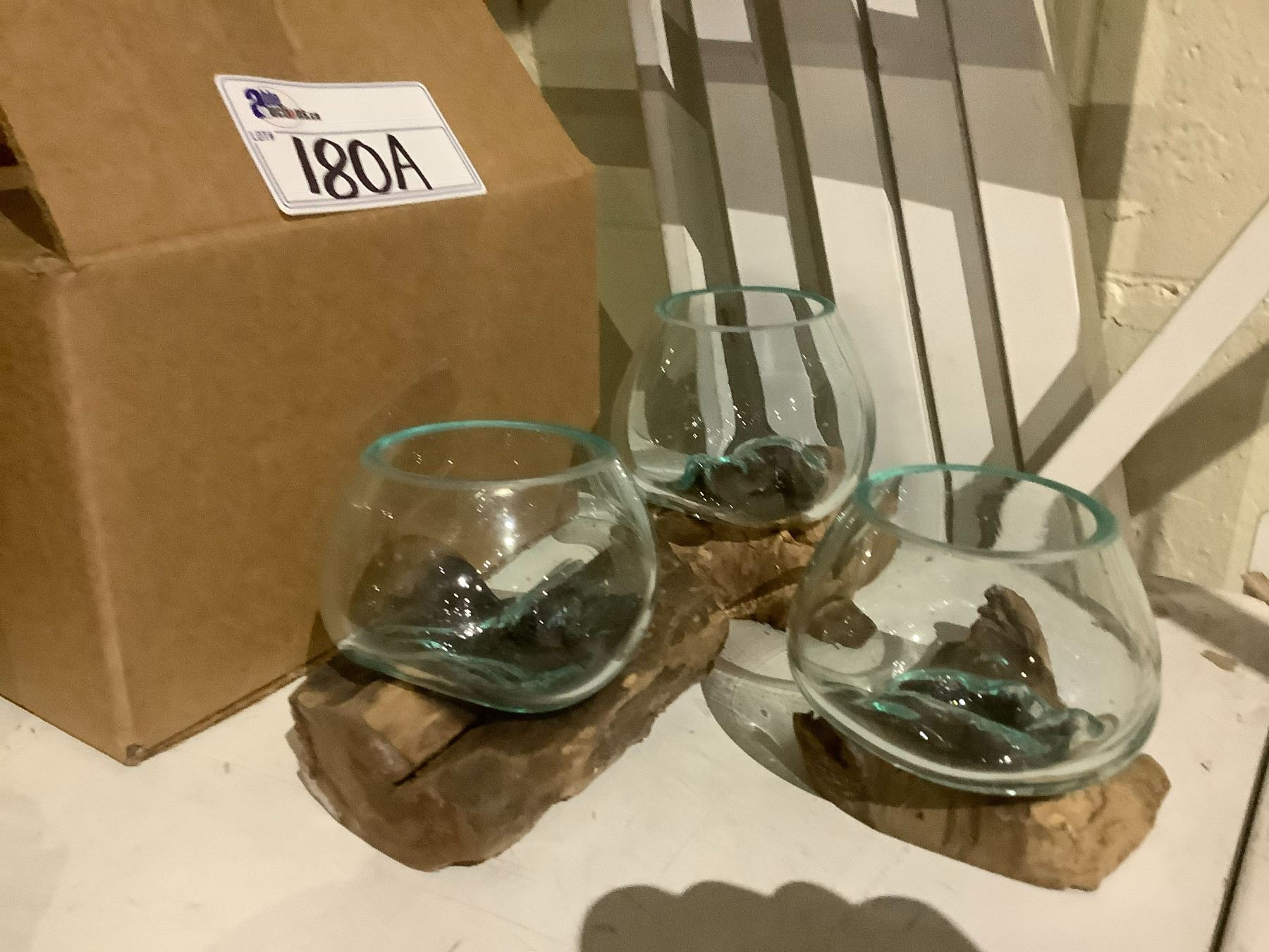 3 HANDMADE MOLTEN GLASS BOWLS ON TEAK WOOD BASES