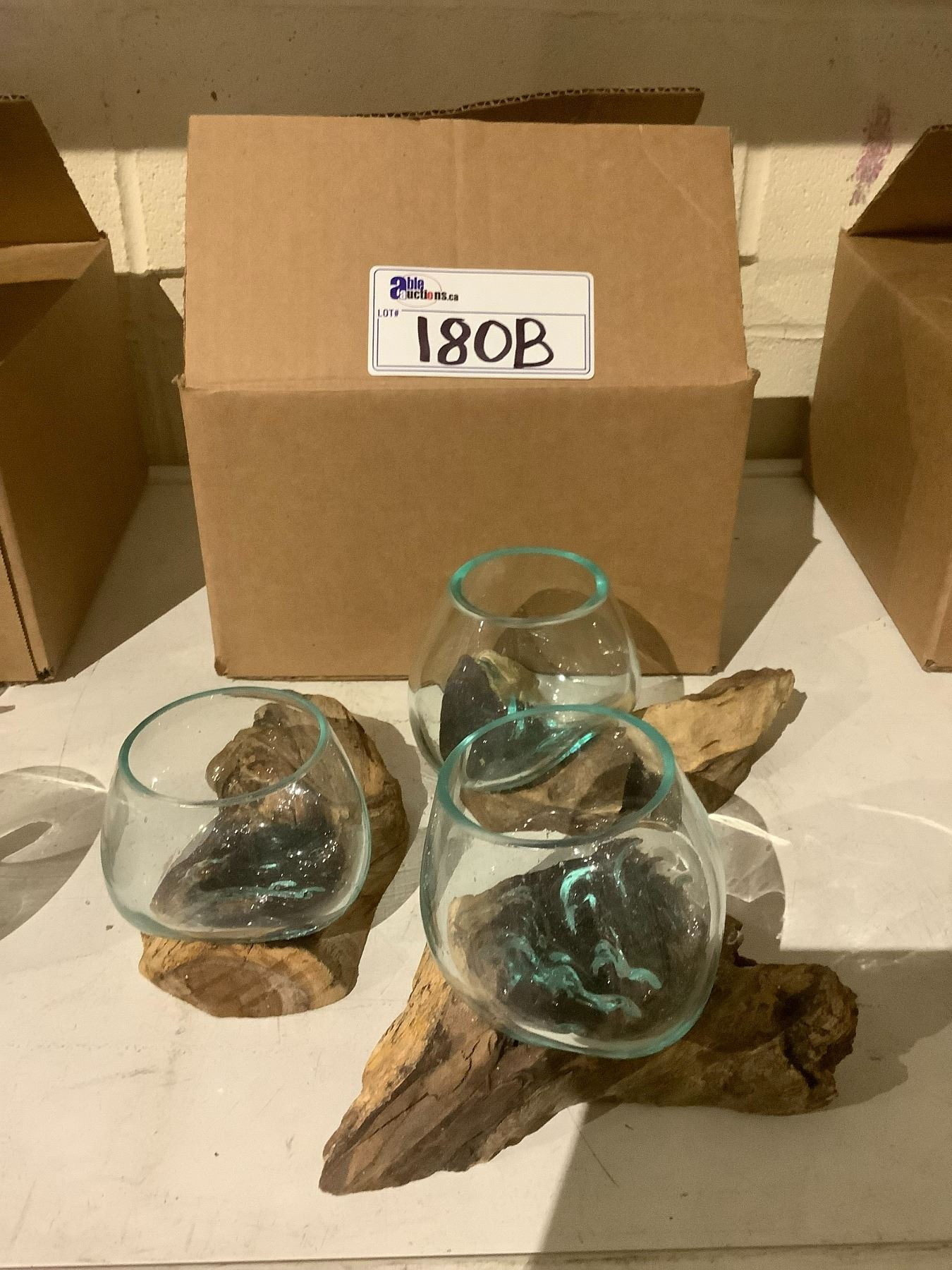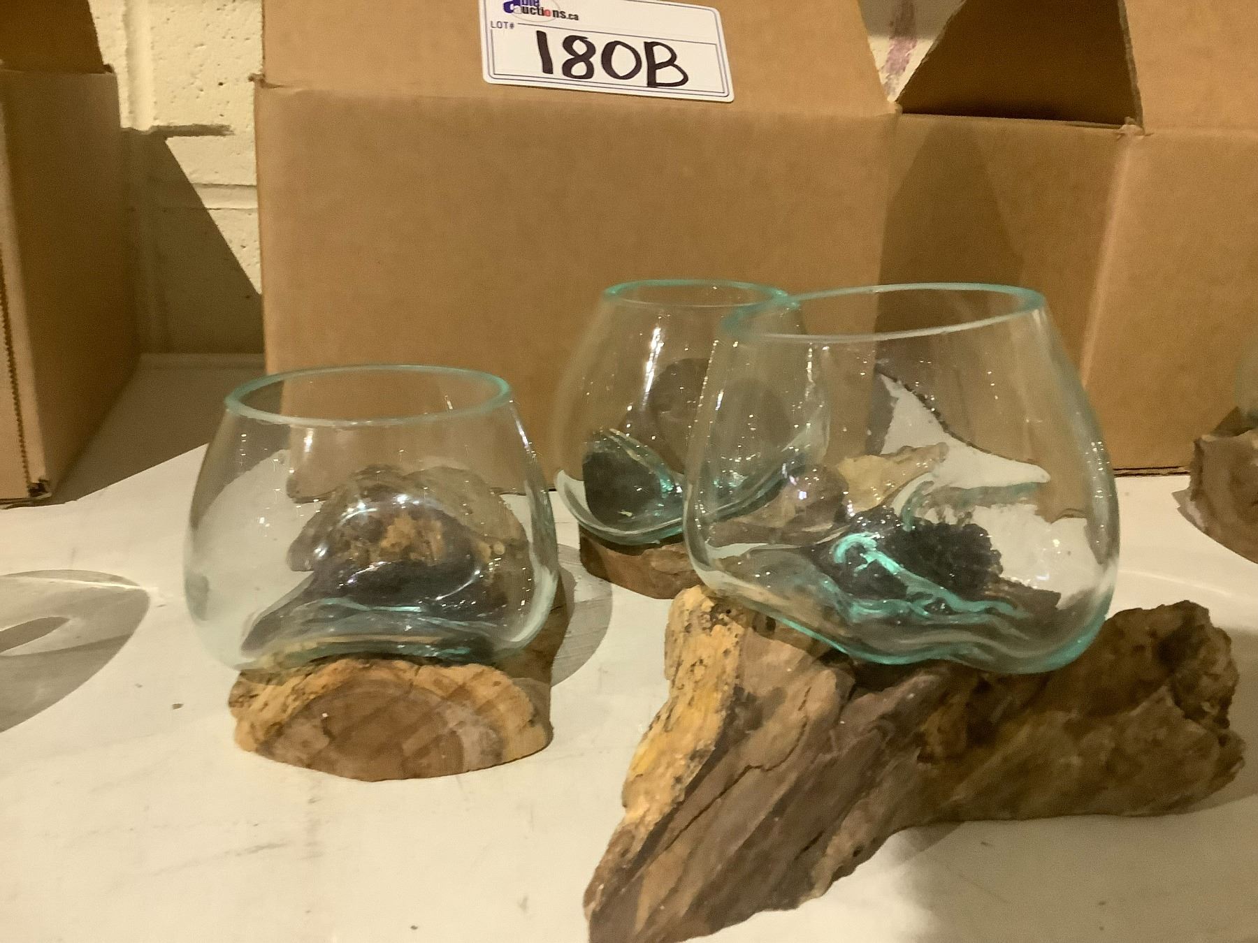 3 HANDMADE MOLTEN GLASS BOWLS ON TEAK WOOD BASES