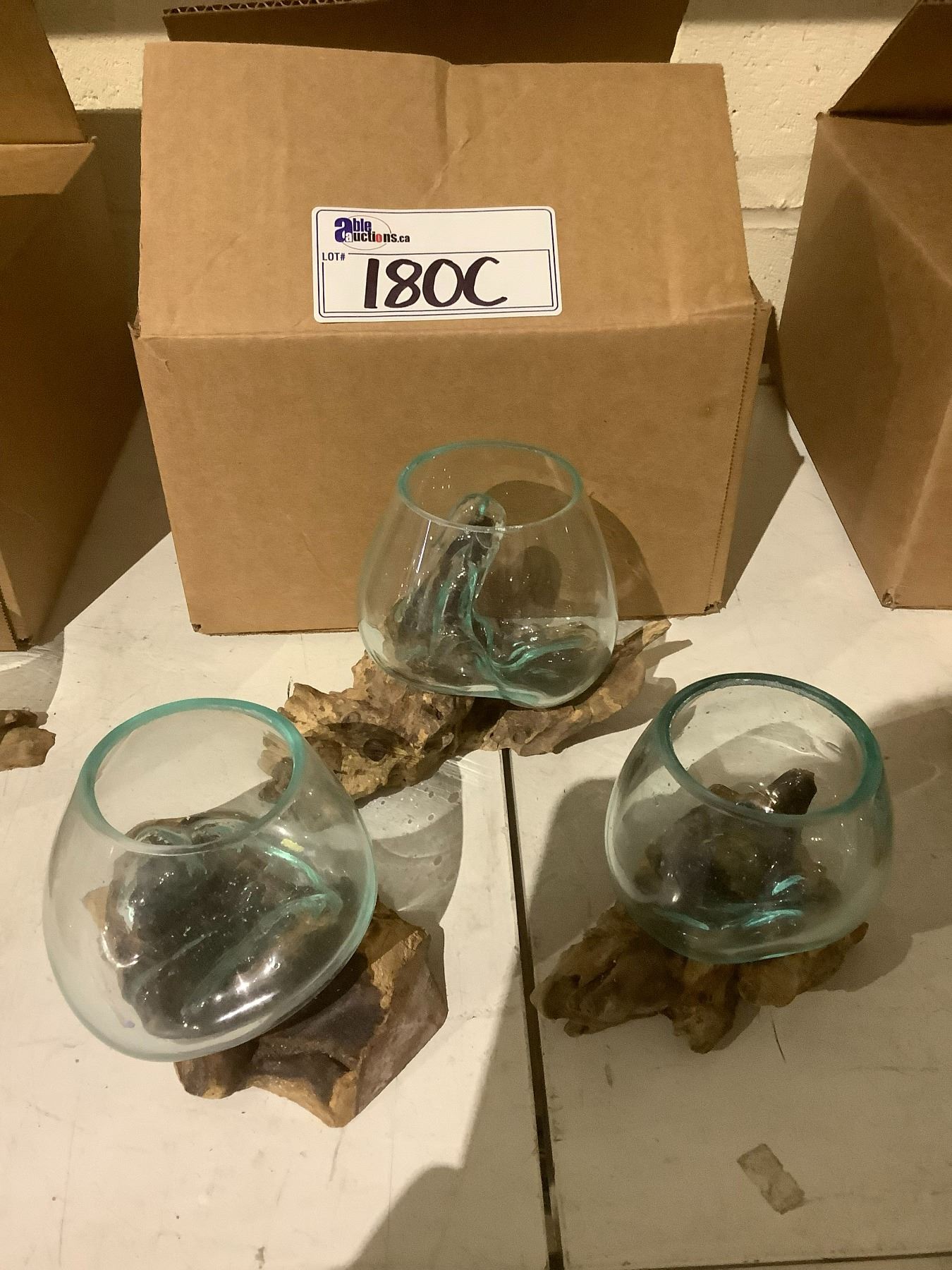 3 HANDMADE MOLTEN GLASS BOWLS ON TEAK WOOD BASES