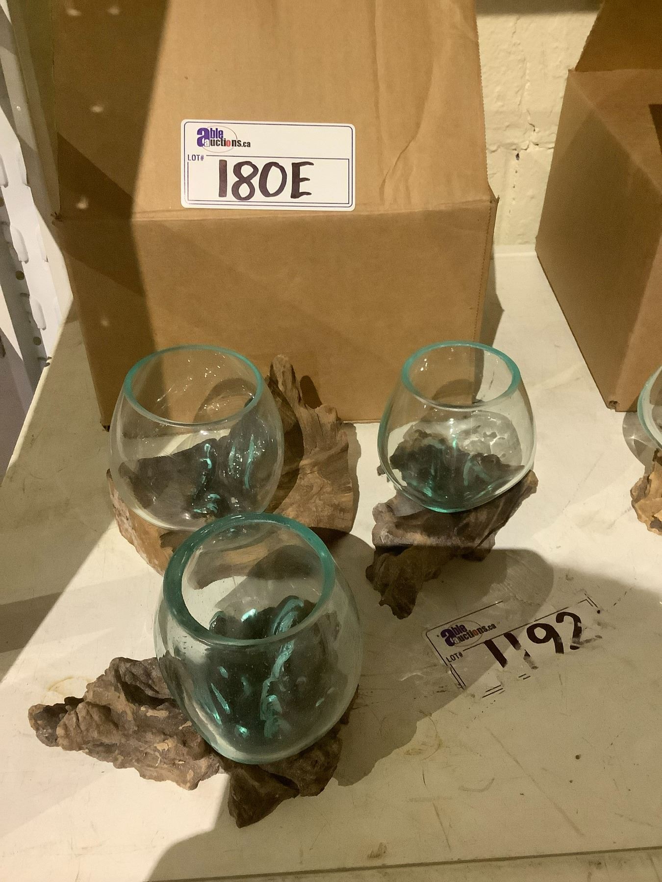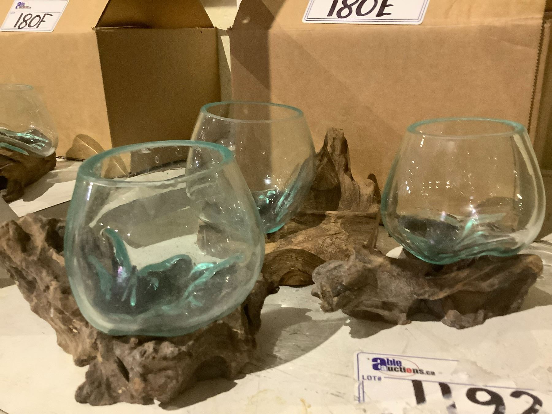 3 HANDMADE MOLTEN GLASS BOWLS ON TEAK WOOD BASES