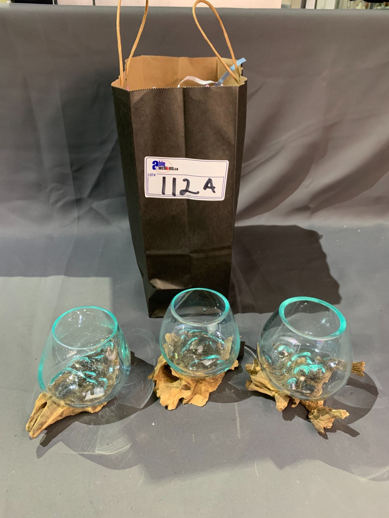 3 HANDMADE MOLTEN GLASS BOWLS ON TEAK WOOD BASES