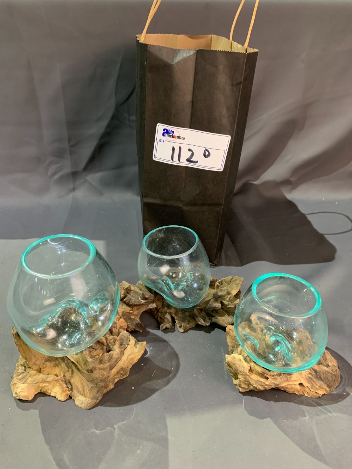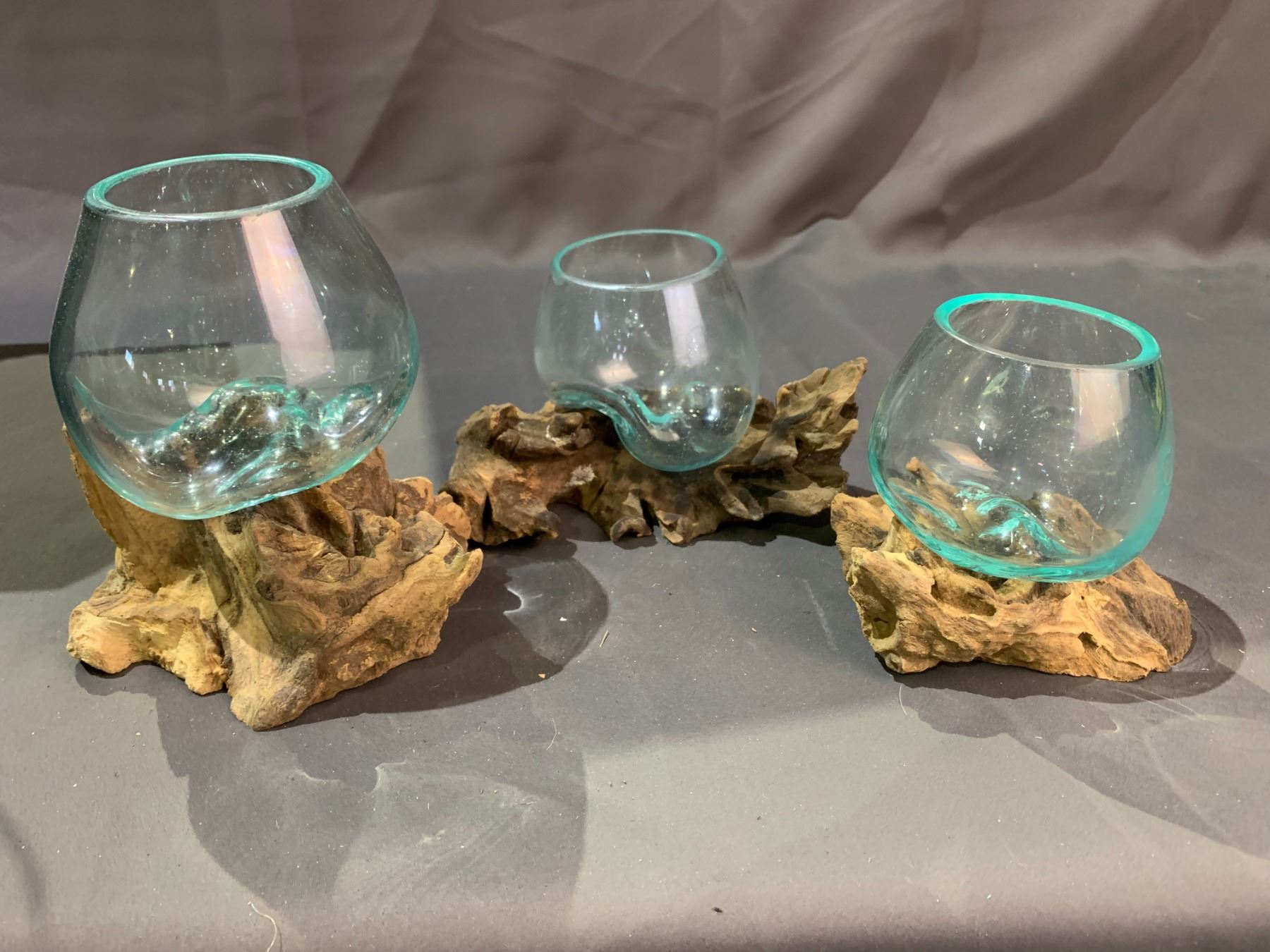 3 HANDMADE MOLTEN GLASS BOWLS ON TEAK WOOD BASES