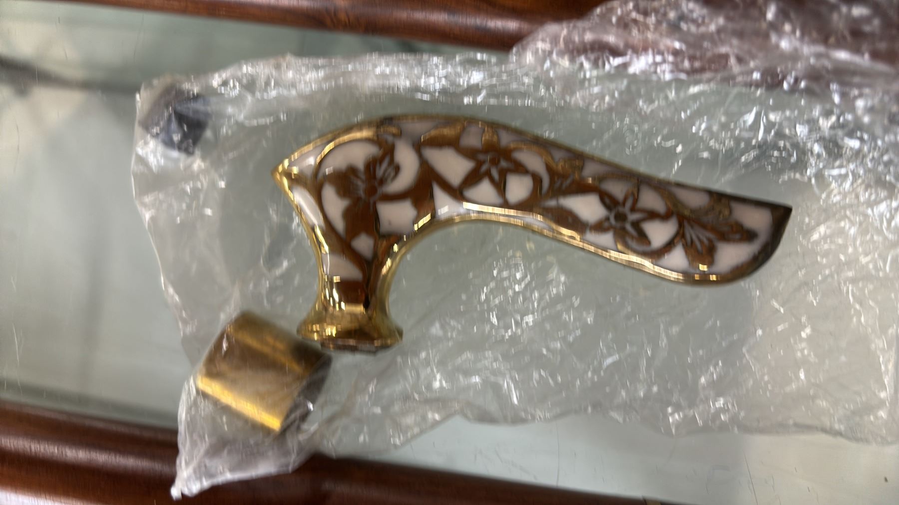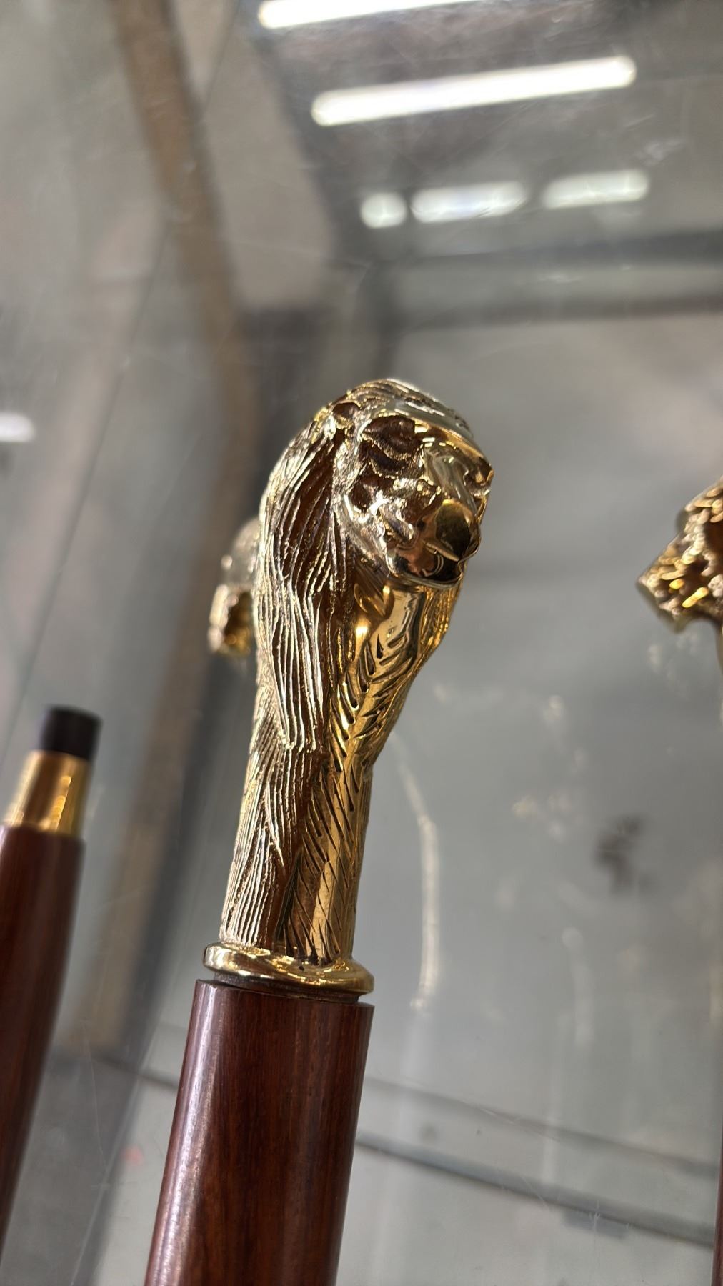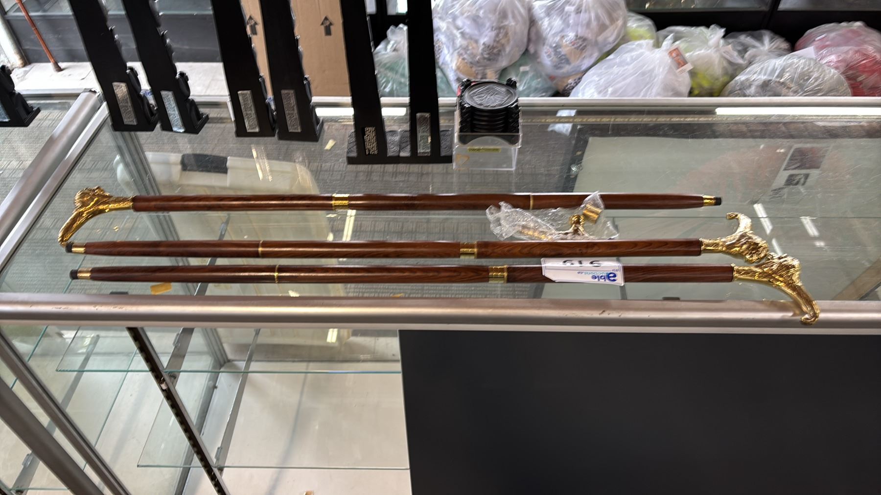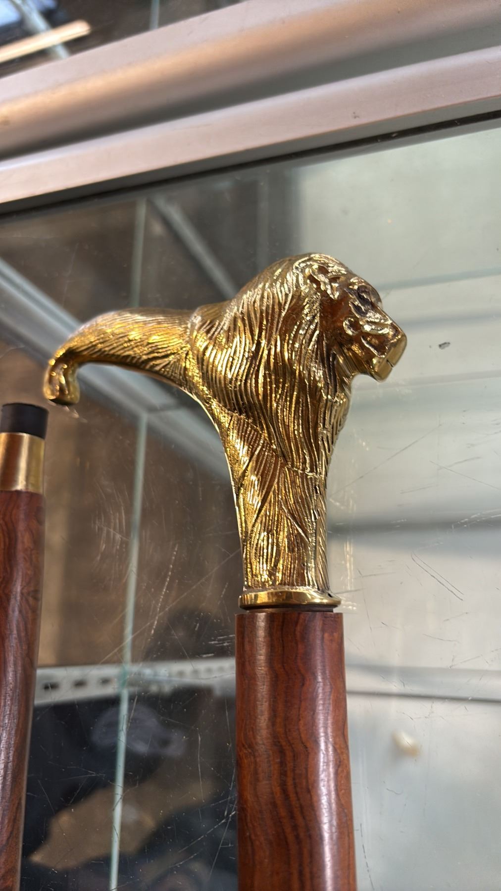 (3) HARDWOOD CANES WITH BRASS LION HEAD HANDLES & 1 EXTRA BRASS & ENAMEL INLAY HANDLE