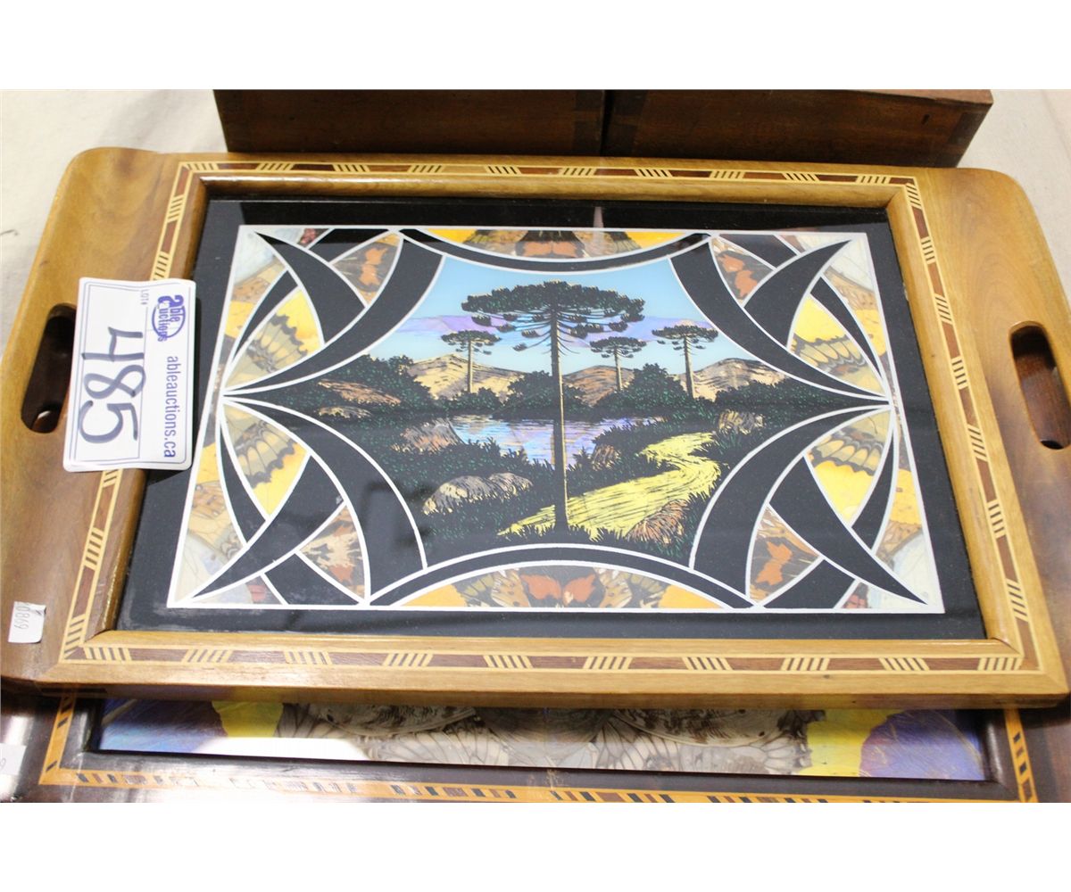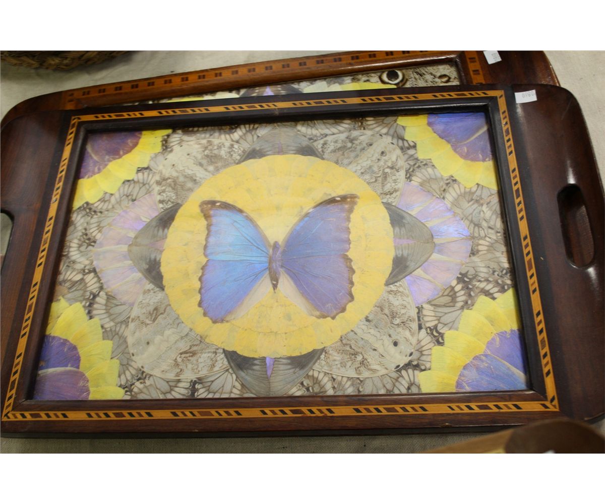 3 INLAID TRAYS, 2 WITH BUTTERFLY WING MOTIFS
