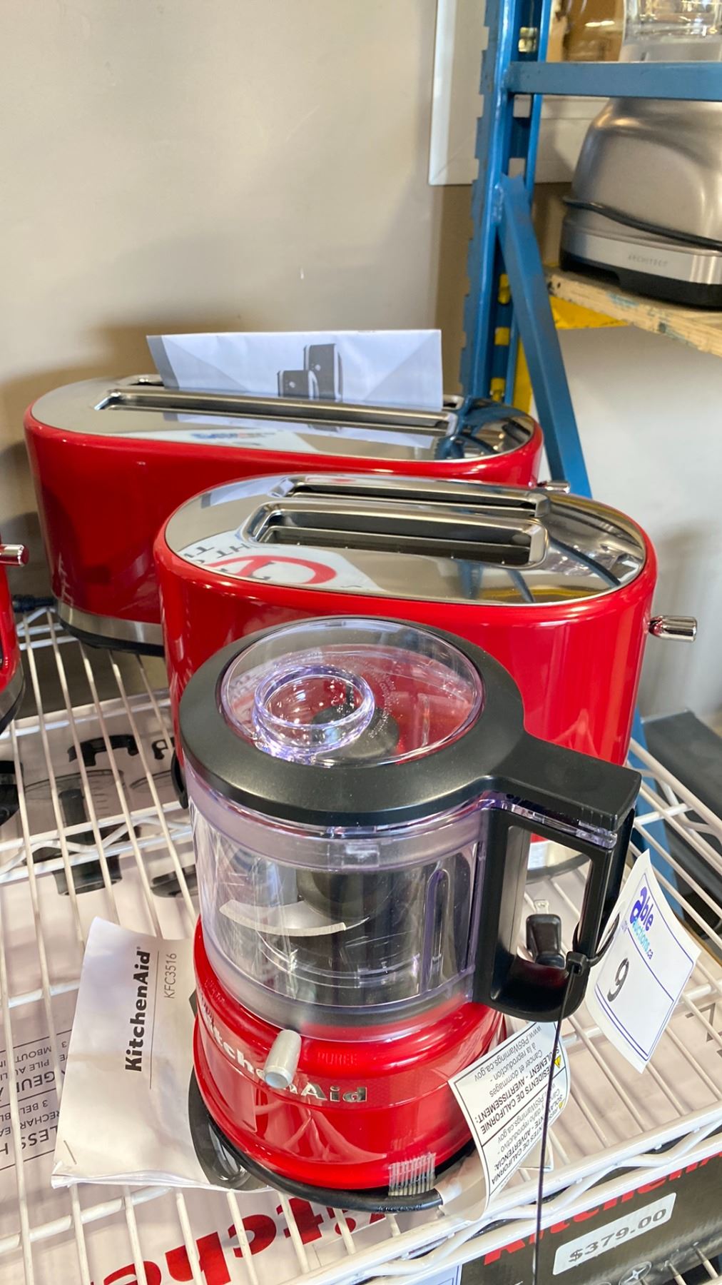 3 KITCHENAID RED COUNTERTOP ELECTRIC SMALL APPLIANCES INCLUDING: KITCHENAID LARGE SLICE TOASTER, KITCHENAID STANDARD TOASTER, & KITCHENAID MINI FOOD PROCESSOR