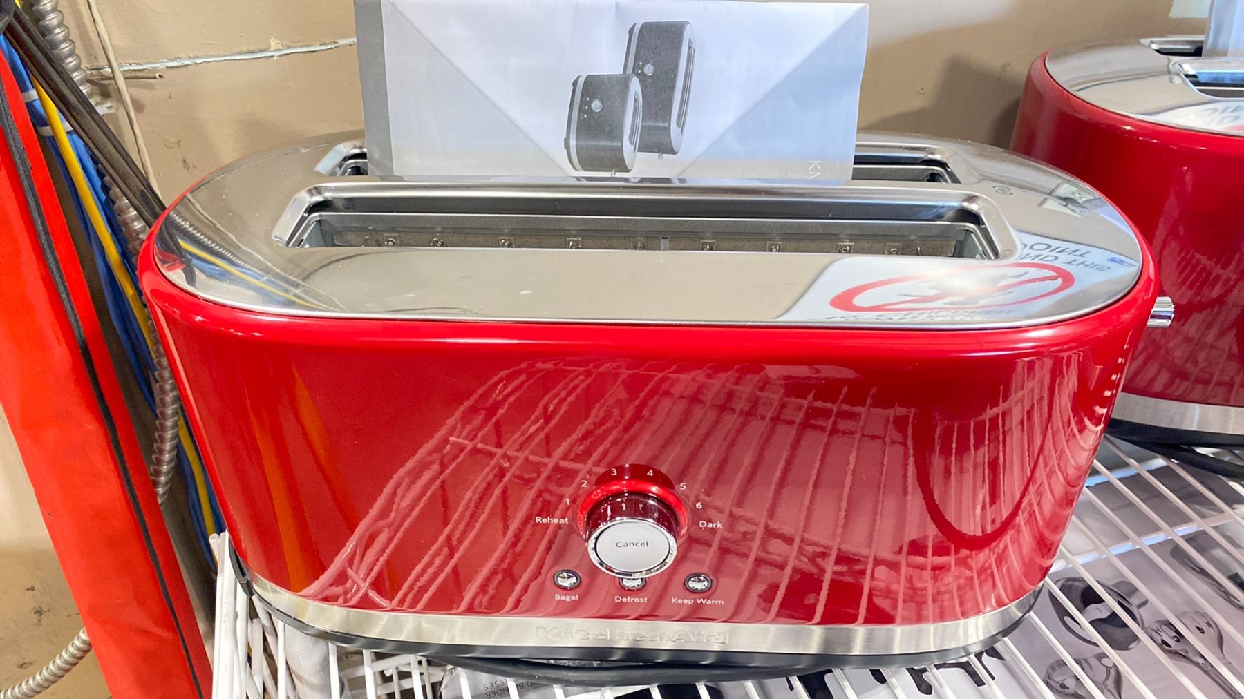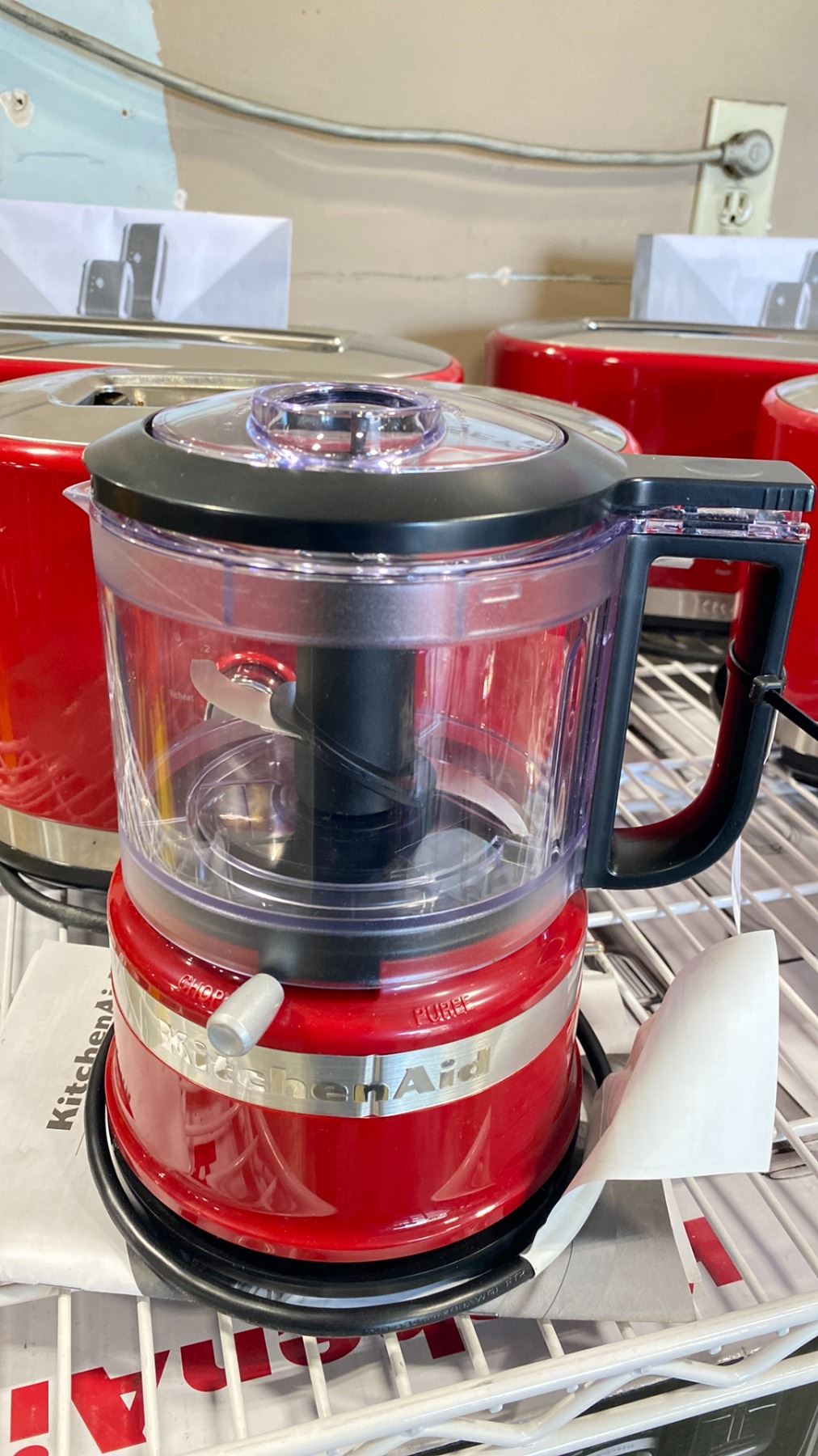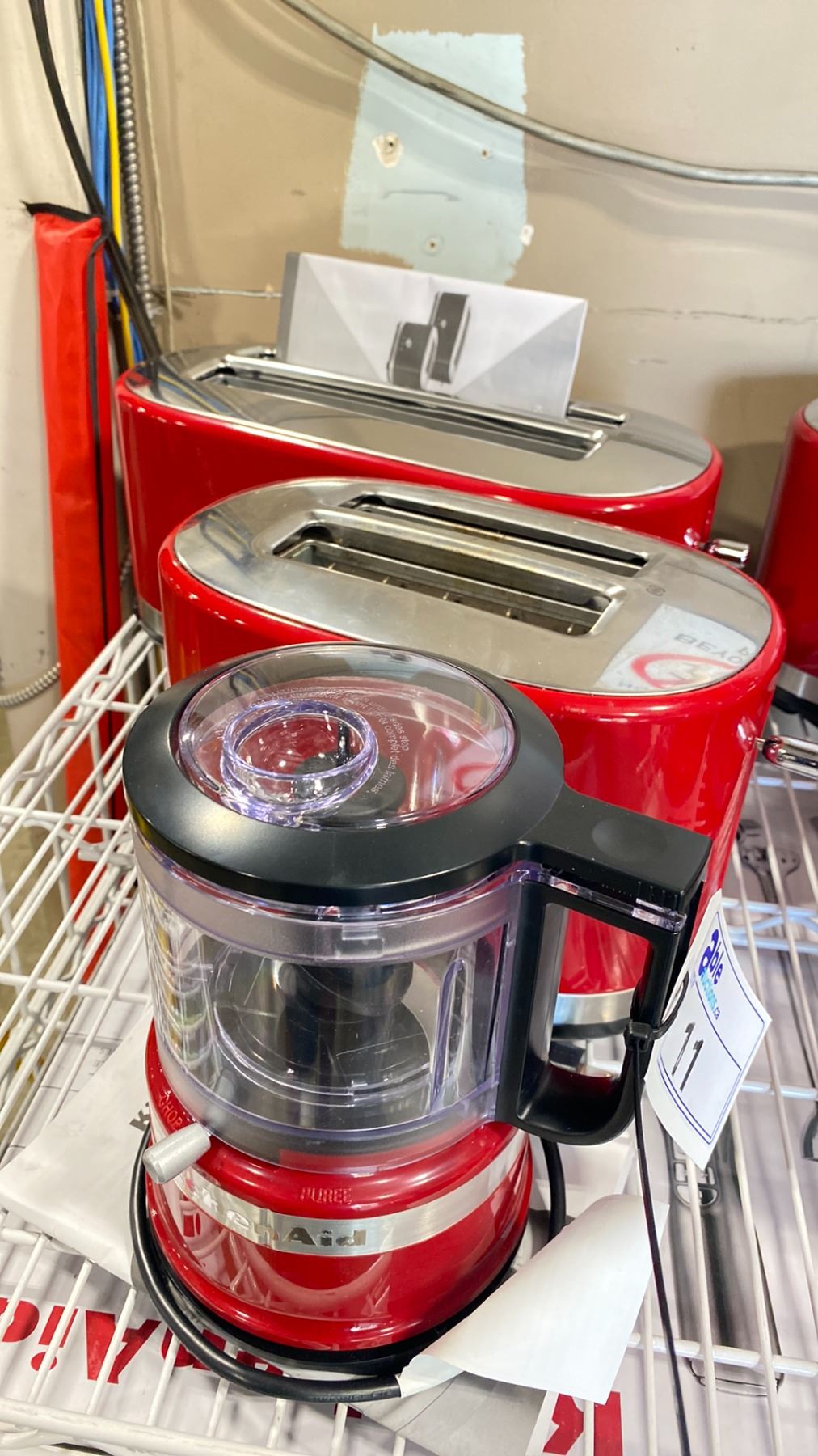 3 KITCHENAID RED COUNTERTOP ELECTRIC SMALL APPLIANCES INCLUDING: KITCHENAID LARGE SLICE TOASTER, KITCHENAID STANDARD TOASTER, & KITCHENAID MINI FOOD PROCESSOR