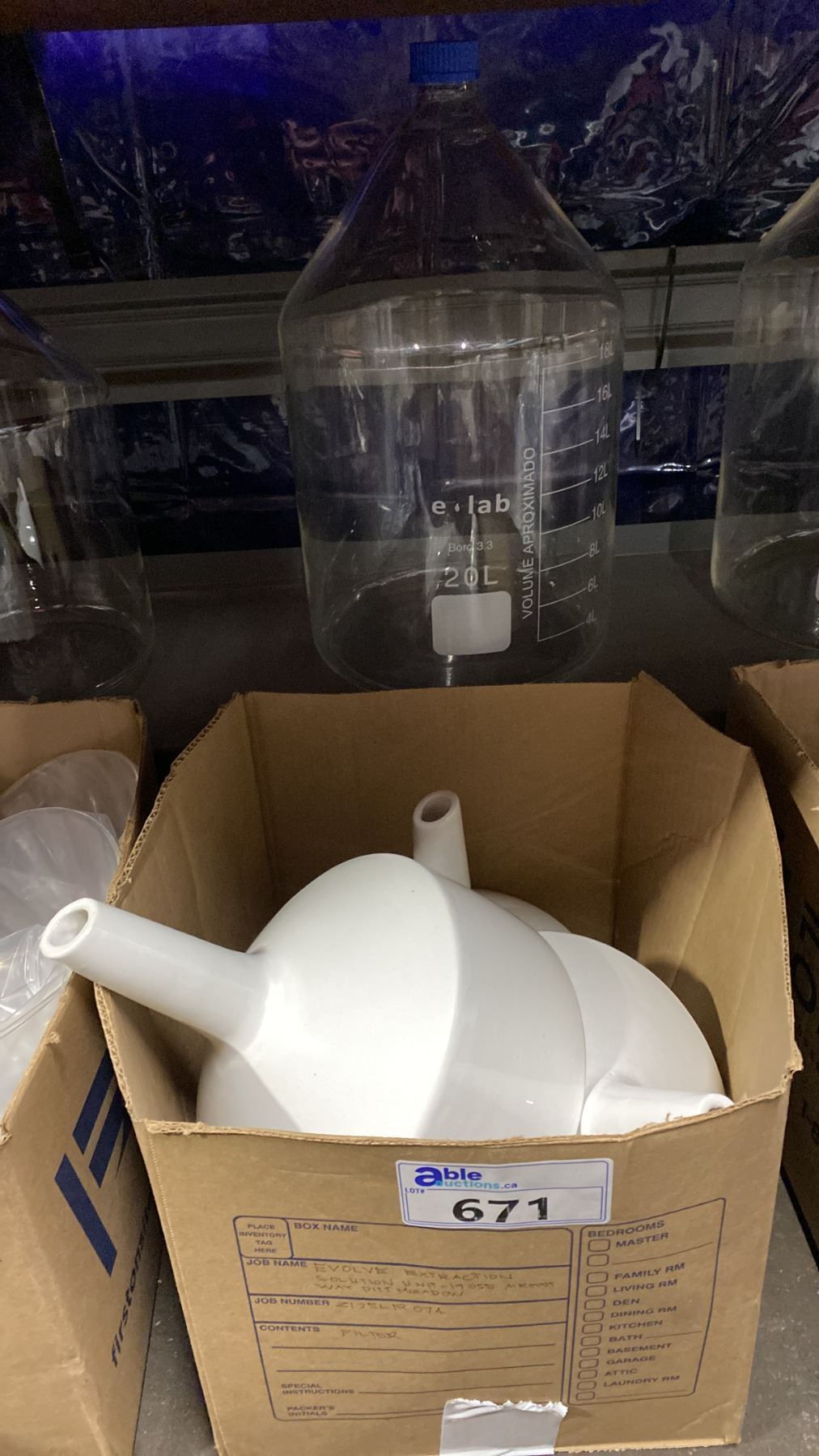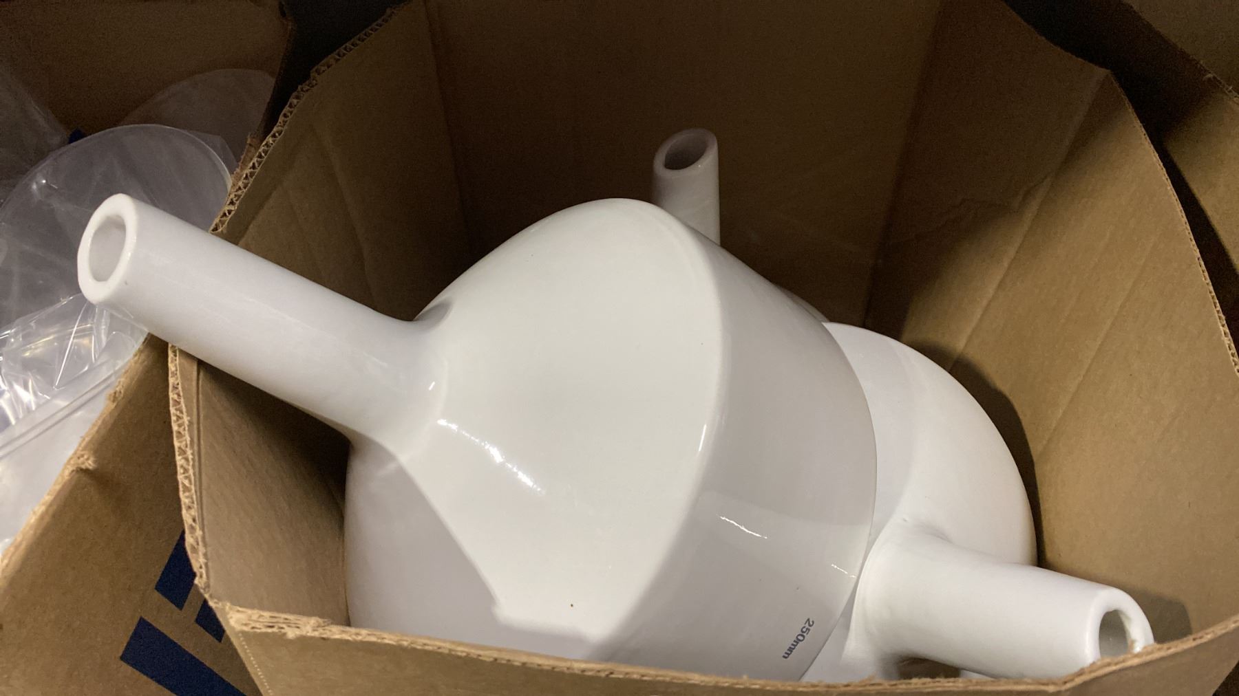 3 LARGE PORCELAIN LABORATORY FUNNELS & LARGE GLASS JAR