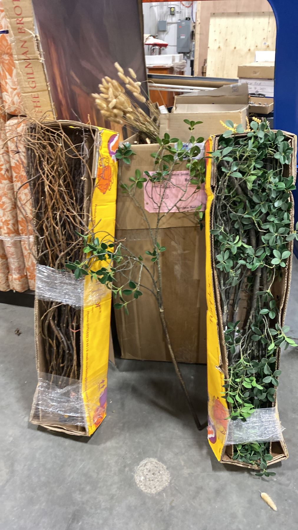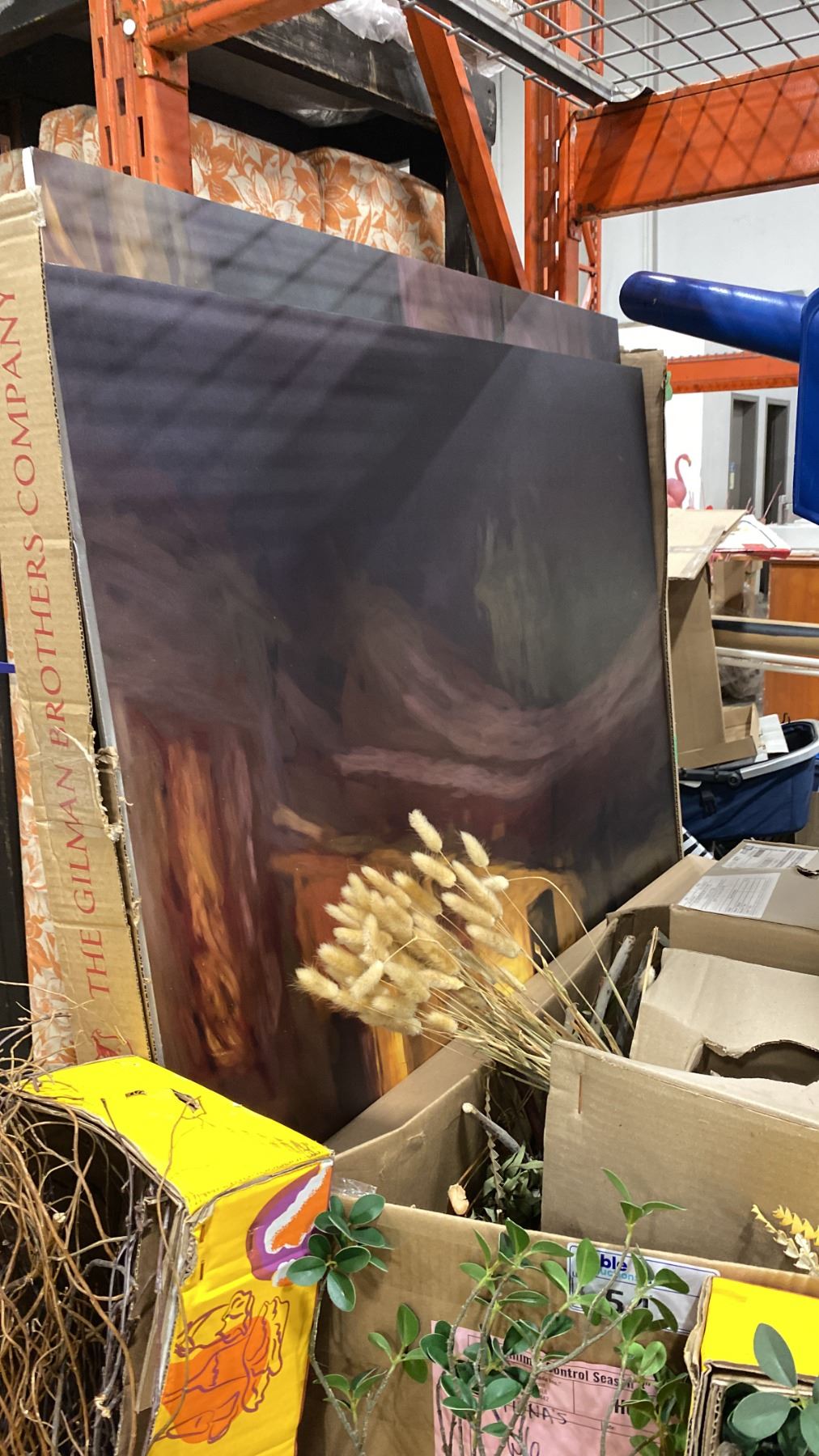 3 LARGE TRIPTYCH PRINTS & BOX OF SET DEC PROPS/DECORATIONS