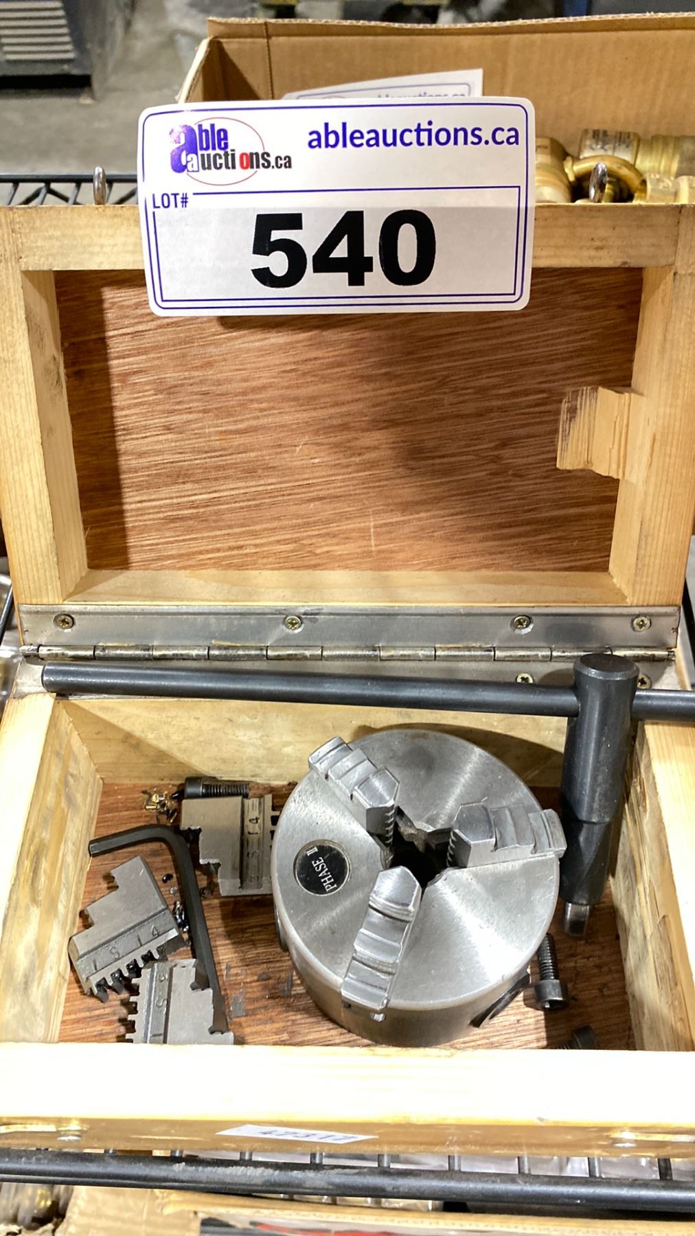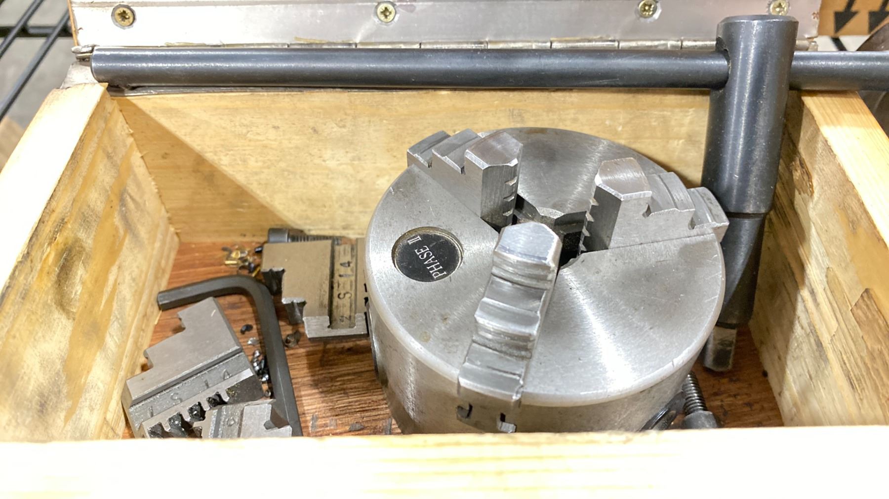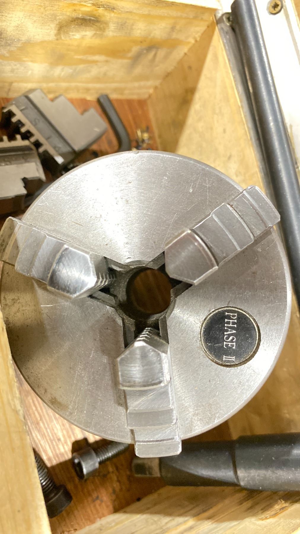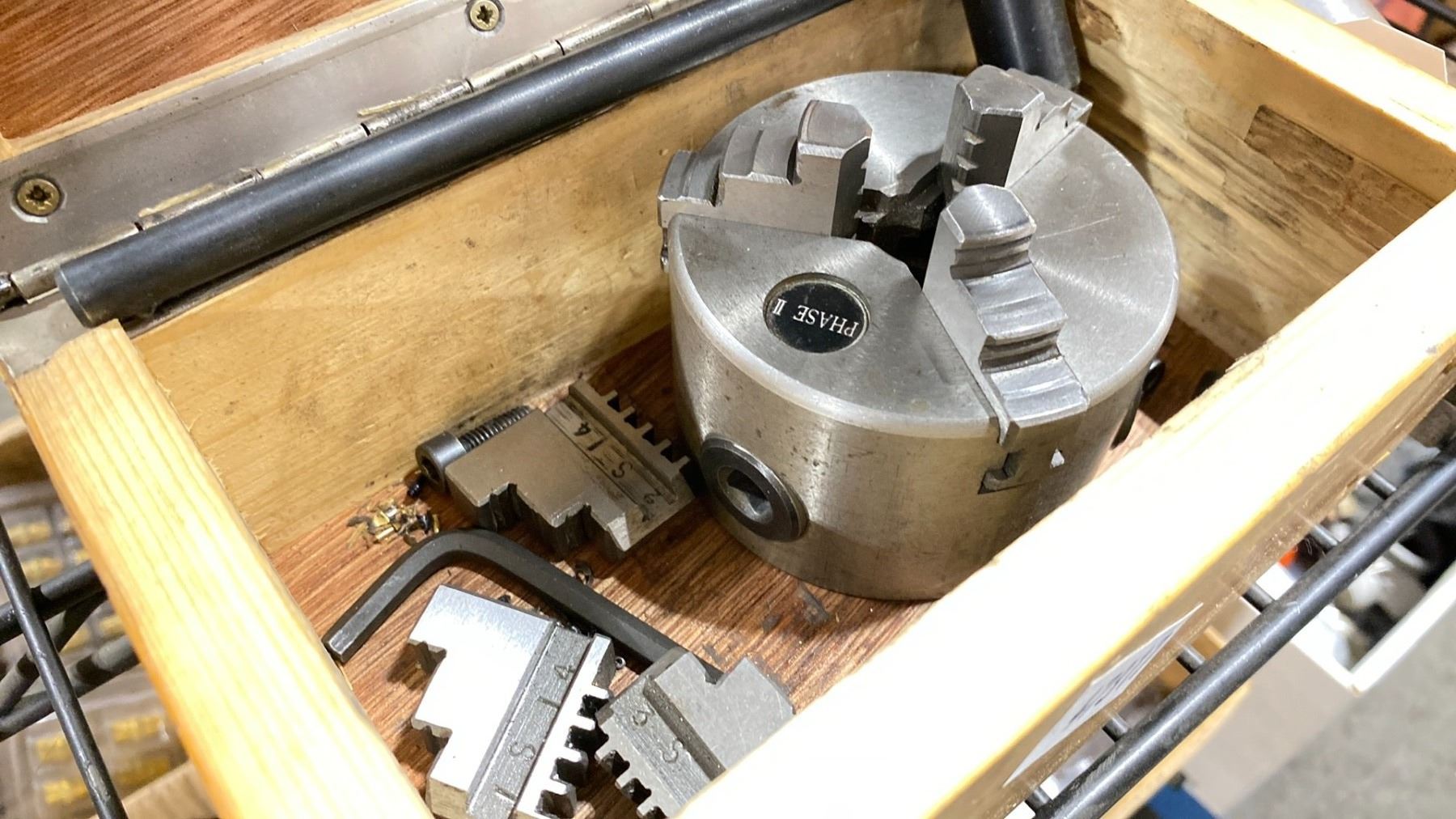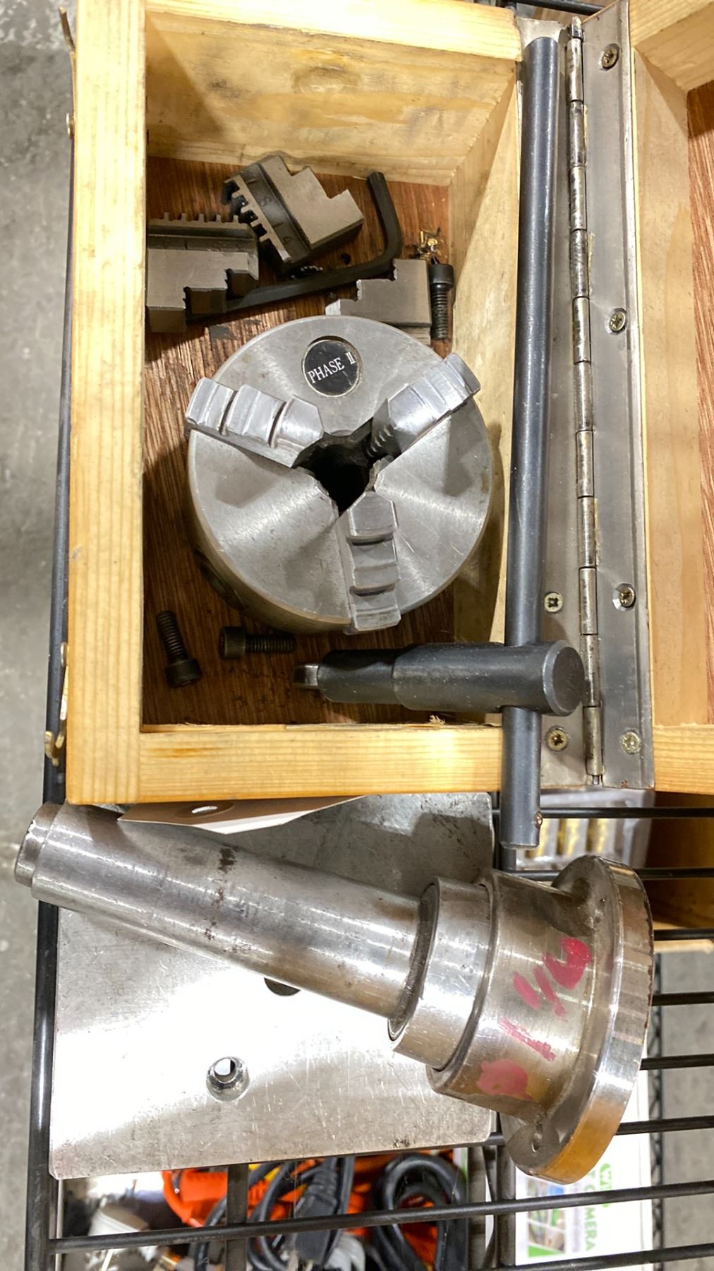 3" LATHE CHUCK WITH (2) SETS OF JAWS, TOOLS, PARTS AND SMALL WOODEN BOX