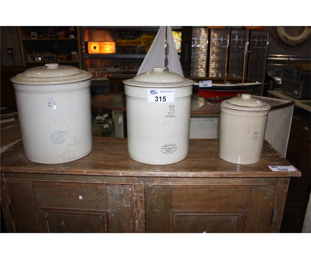 3 LIDDED STONE WARE CROCKS; 5GALLON, 3GALLON MADELTA, AND 1 GALLON MADELTA