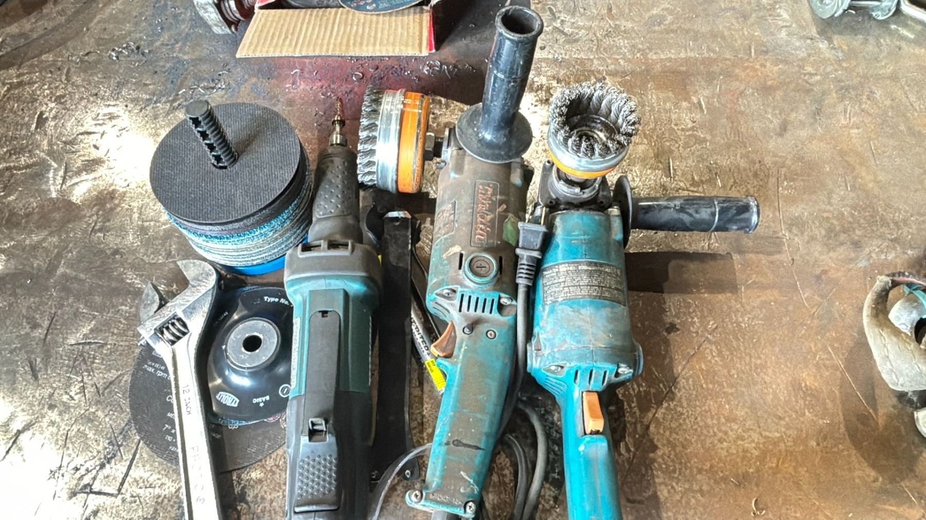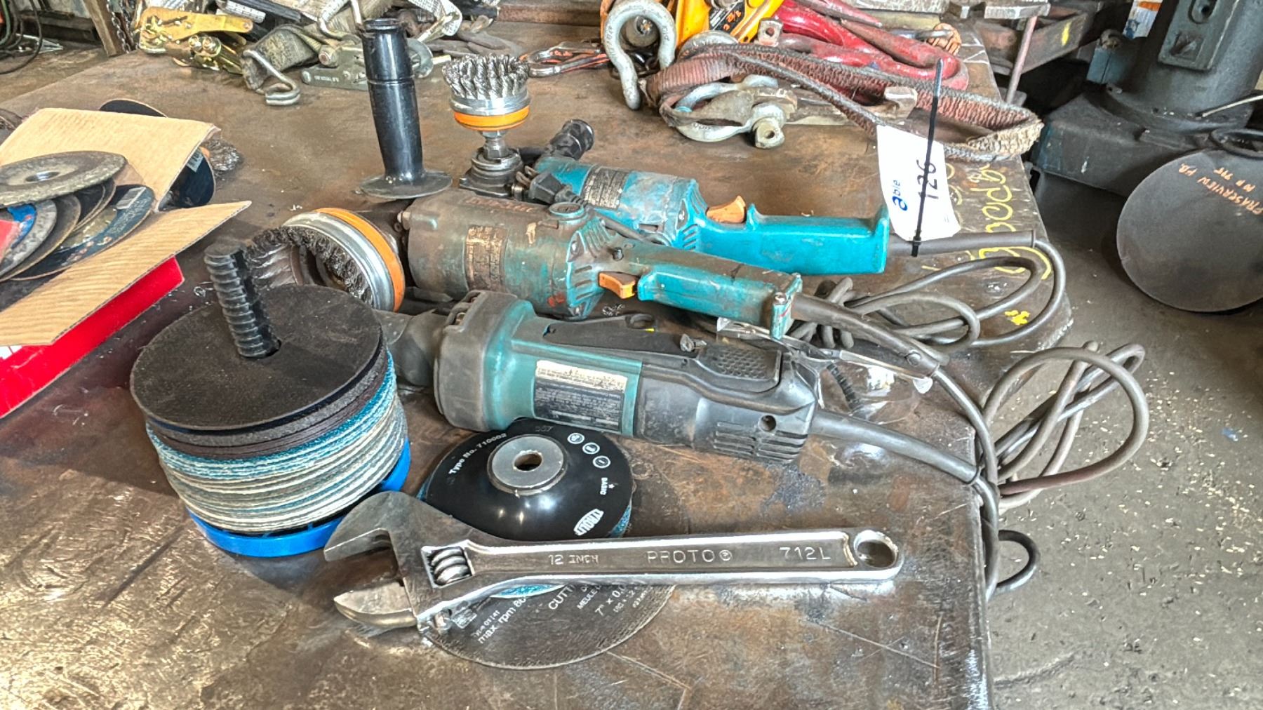 3 MAKITA GRINDERS WITH ASSORTED GRINDING DISCS AND BRUSHES