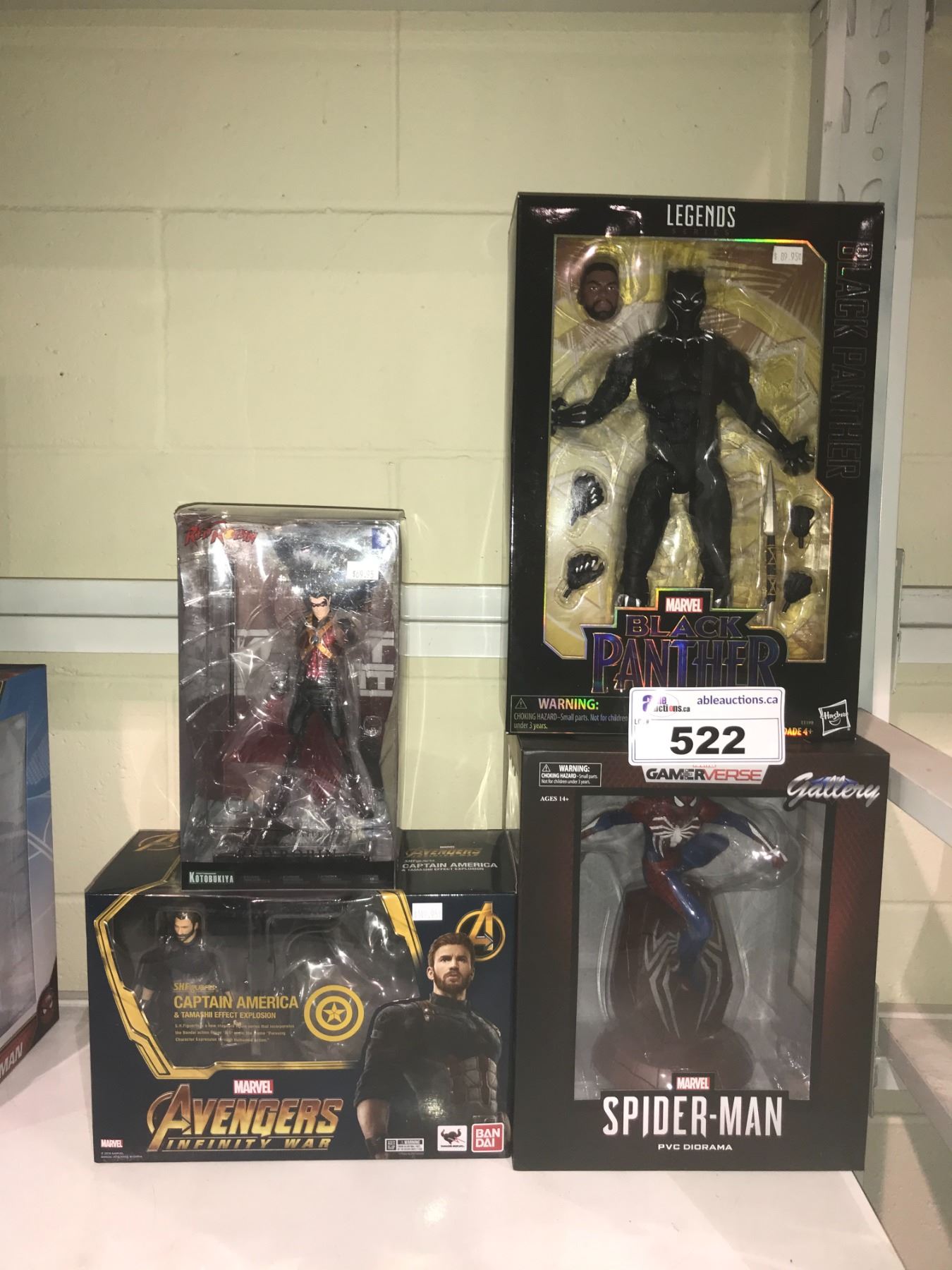 3 NEW IN BOX MARVEL TOYS (BLACK PANTHER, CAPTAIN AMERICA, SPIDERMAN) & RED ROBIN