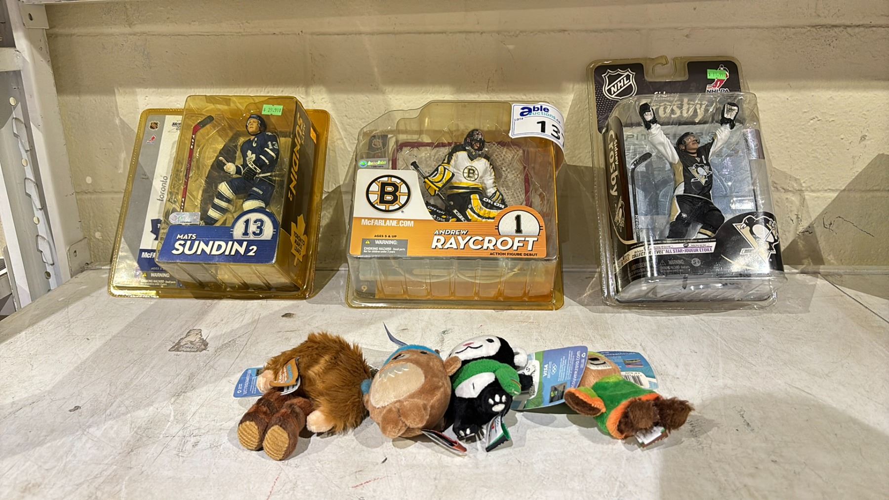 3 NHL PLAYER FIGURES INCLUDING; RAYCROFT, CROSBY & SUNDIN & 2010 OLYMPICS STUFFED KEYCHAIN ANIMALS
