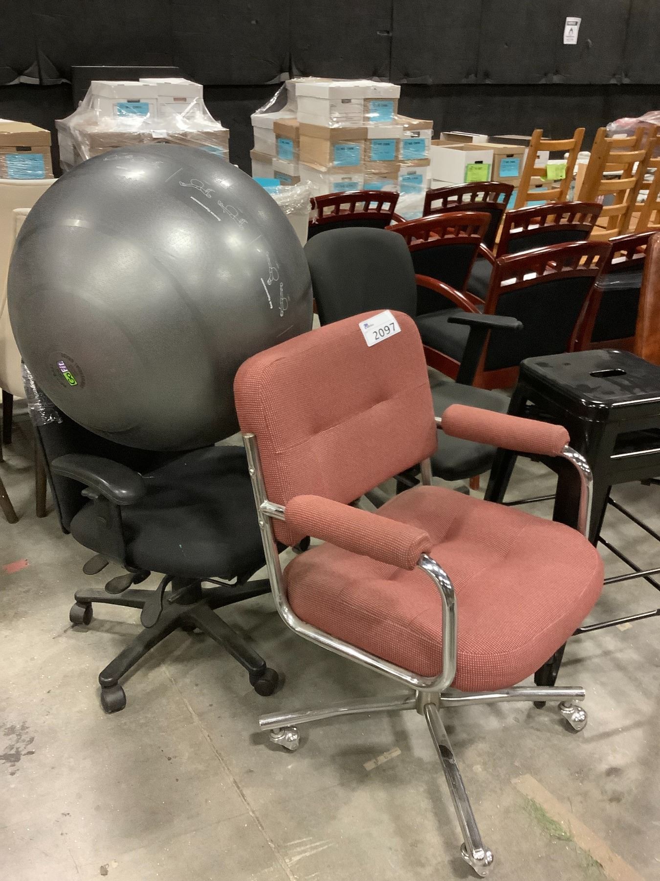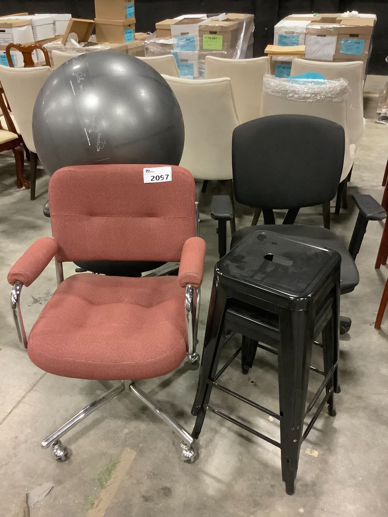 3 OFFICE CHAIRS AND 2 BARSTOOLS AND EXERCISE BALL