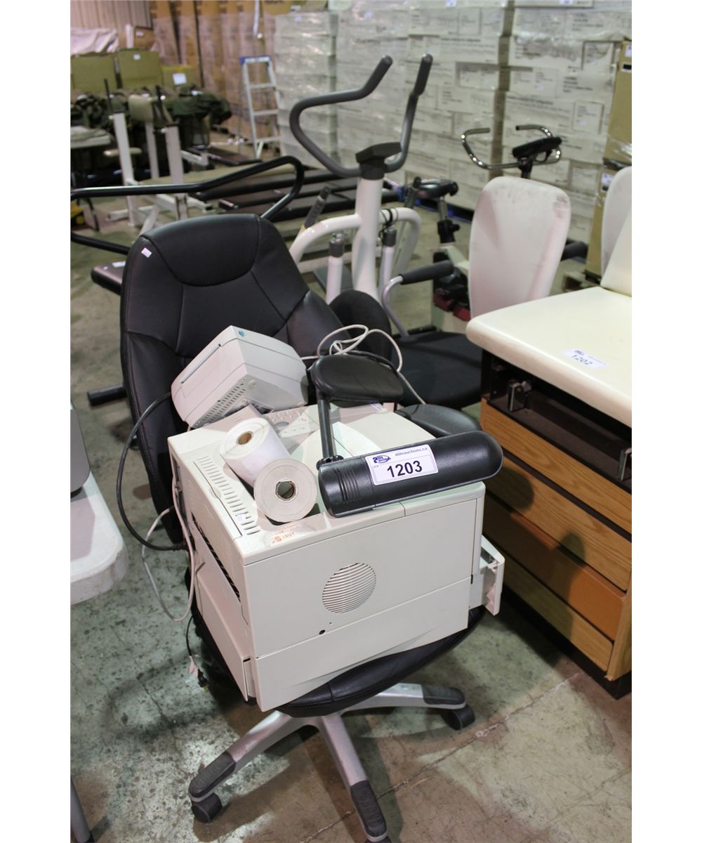 3 OFFICE CHAIRS, PRINTER AND CABLES