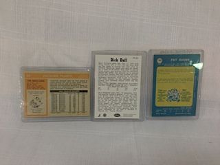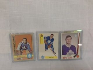 3 OLDER TORONTO MAPLE LEAF COLLECTOR CARDS INCL 1973 JACQUES PLANTE CARD, 1968/69 PAT QUINN CARD & A DICK DUFF CARD