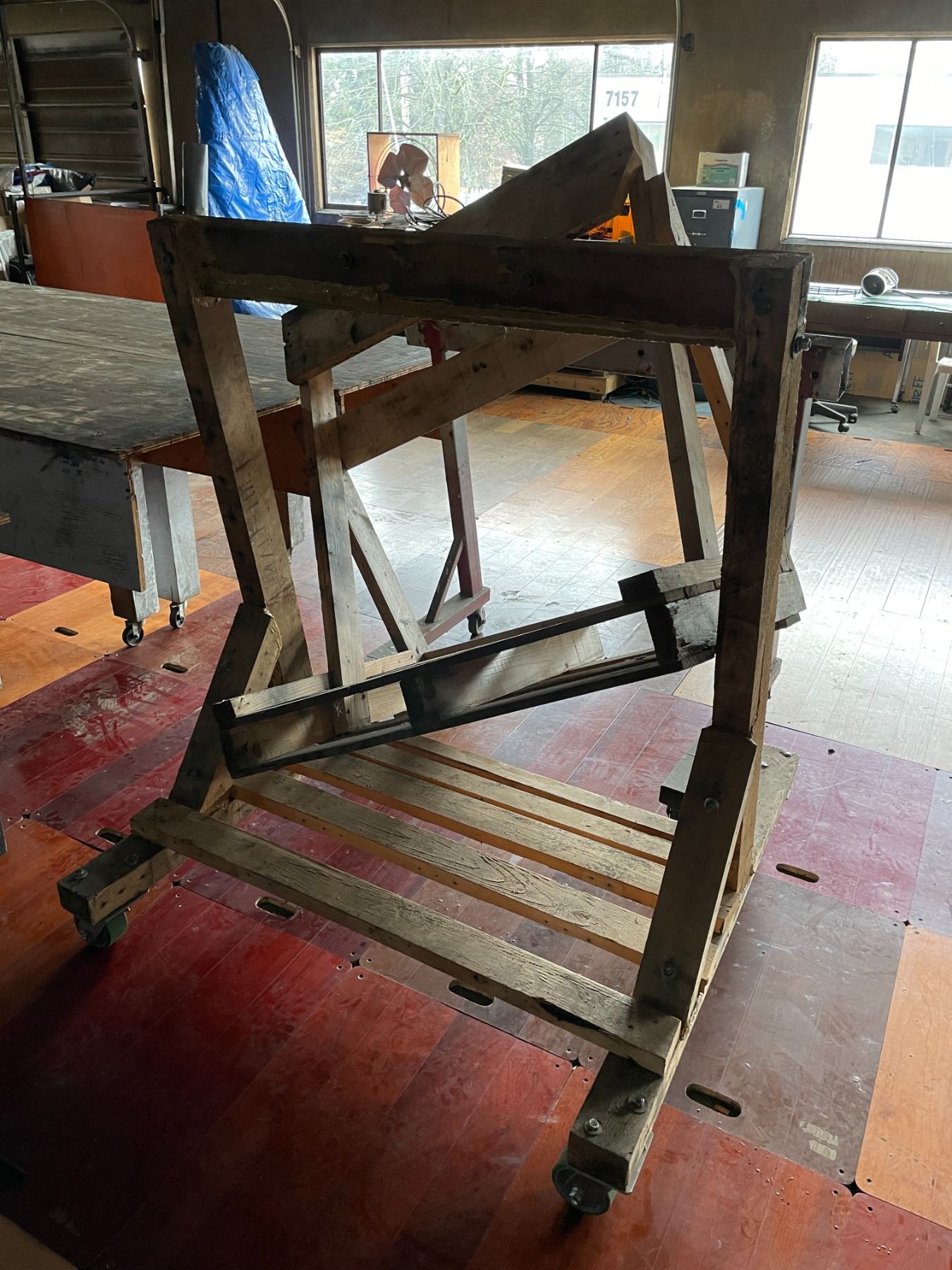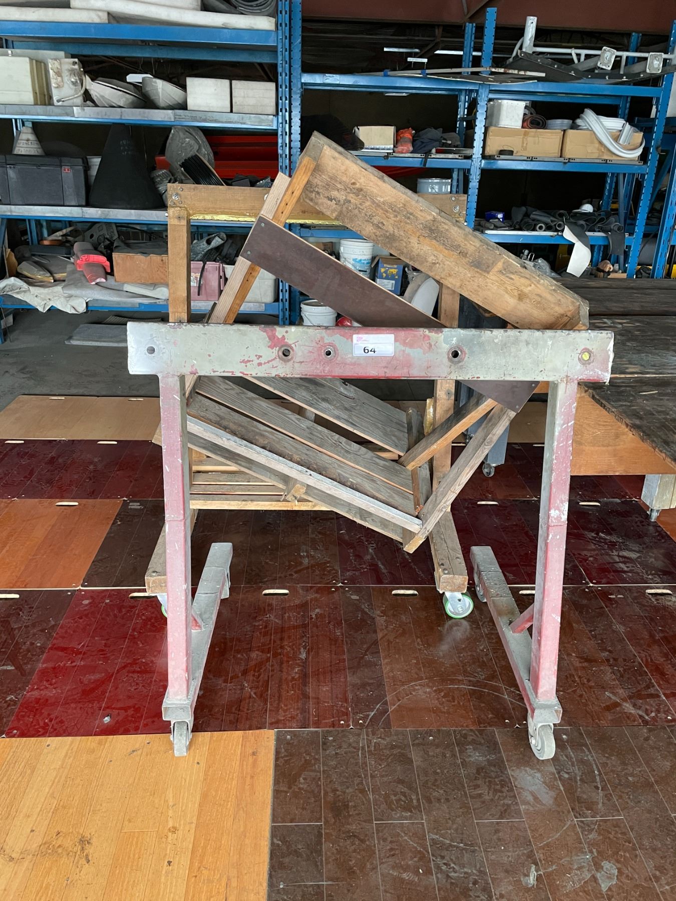 3 OUTBOARD MOTOR STANDS: 1 METAL MOBILE, 1 WOODEN MOBILE & 1 WOODEN PALLET STYLE LOCATED ON UPPER MEZZANINE