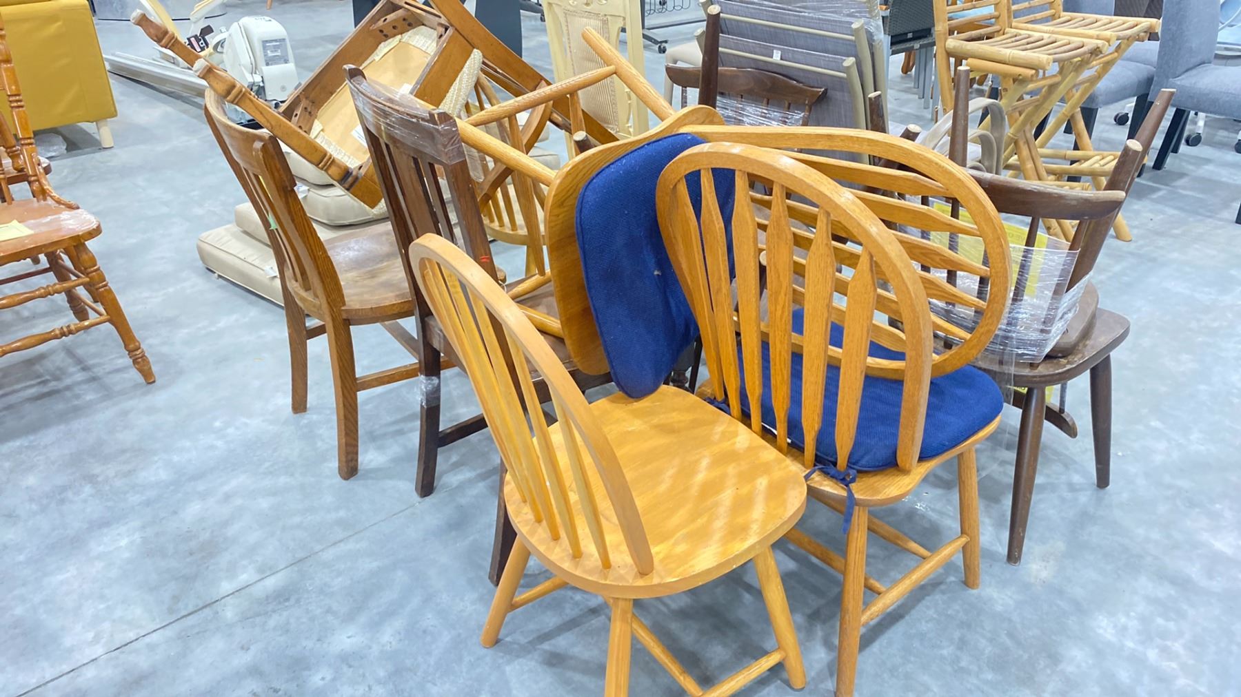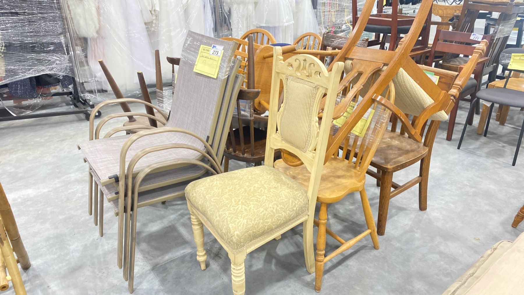 ( 3 ) OUTDOOR PATIO CHAIRS & A GROUP OF WOODEN DINING CHAIRS