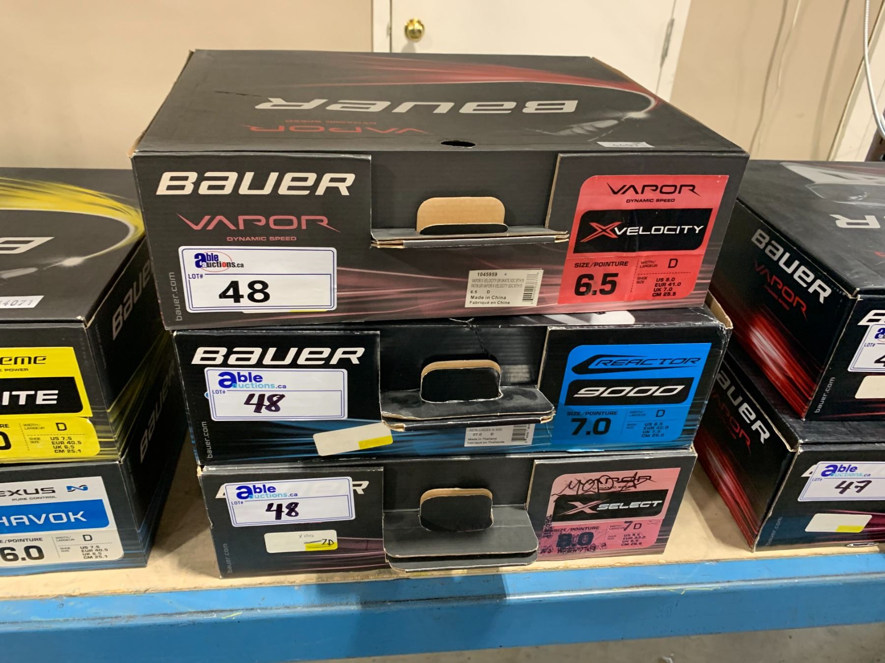 3 PAIRS OF BOXED PROFESSIONAL HOCKEY ICE SKATES: BAUER VAPOR X VELOCITY ( SR SIZE: 6.5, D WIDTH ) BAUER VAPOR X SELECT ( SR SIZE: 7, D WIDTH ) BAUER REACTOR 9000 ( SR SIZE: 7, D WIDTH )