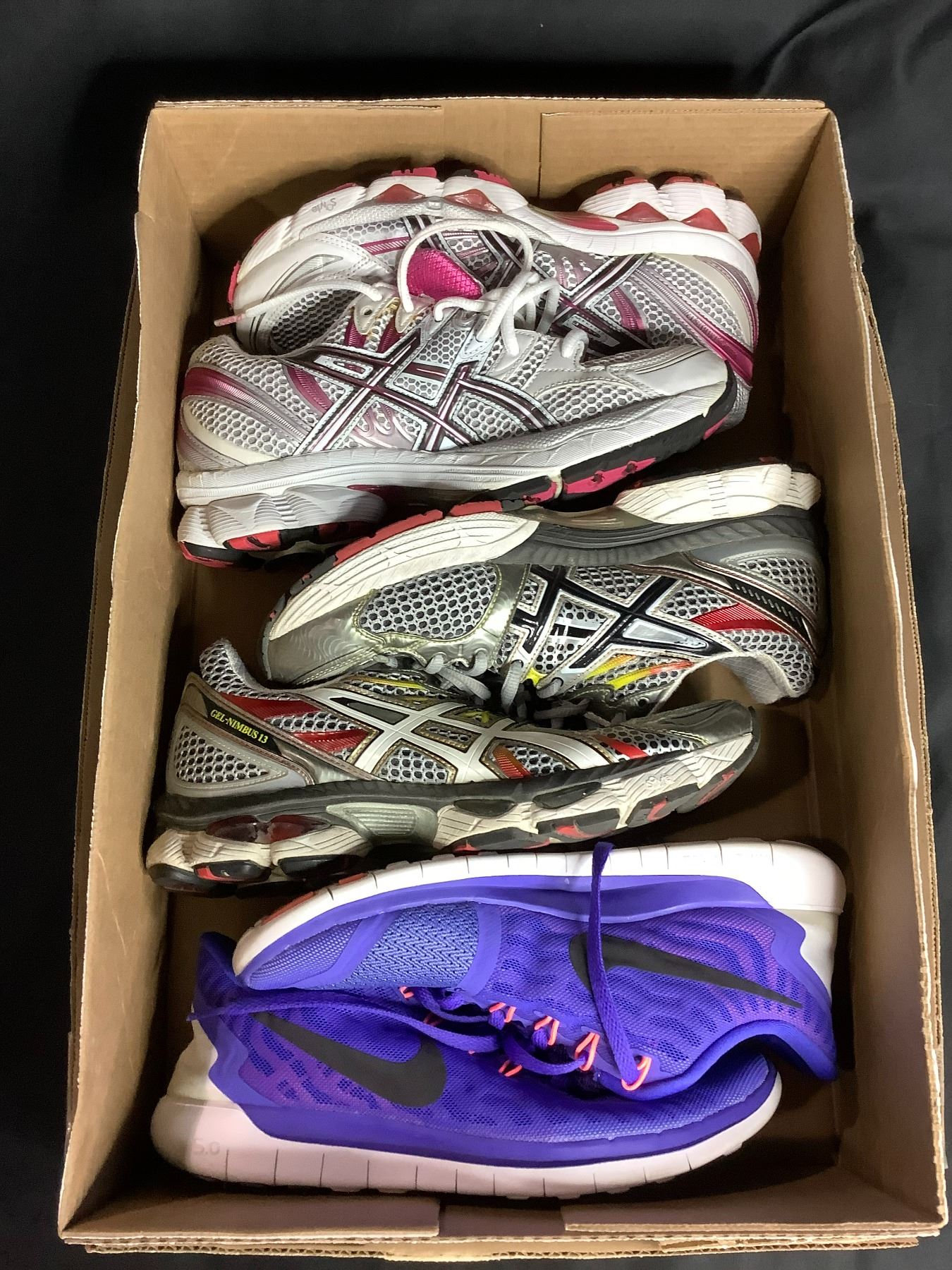 3 PAIRS RUNNERS. NIKE FREE 5.0 LADIES SIZE 8.5, ASICS NIMBUS 12 LADIES SIZE 8, ASICS NIMBUS 13 LADIES SIZE 7