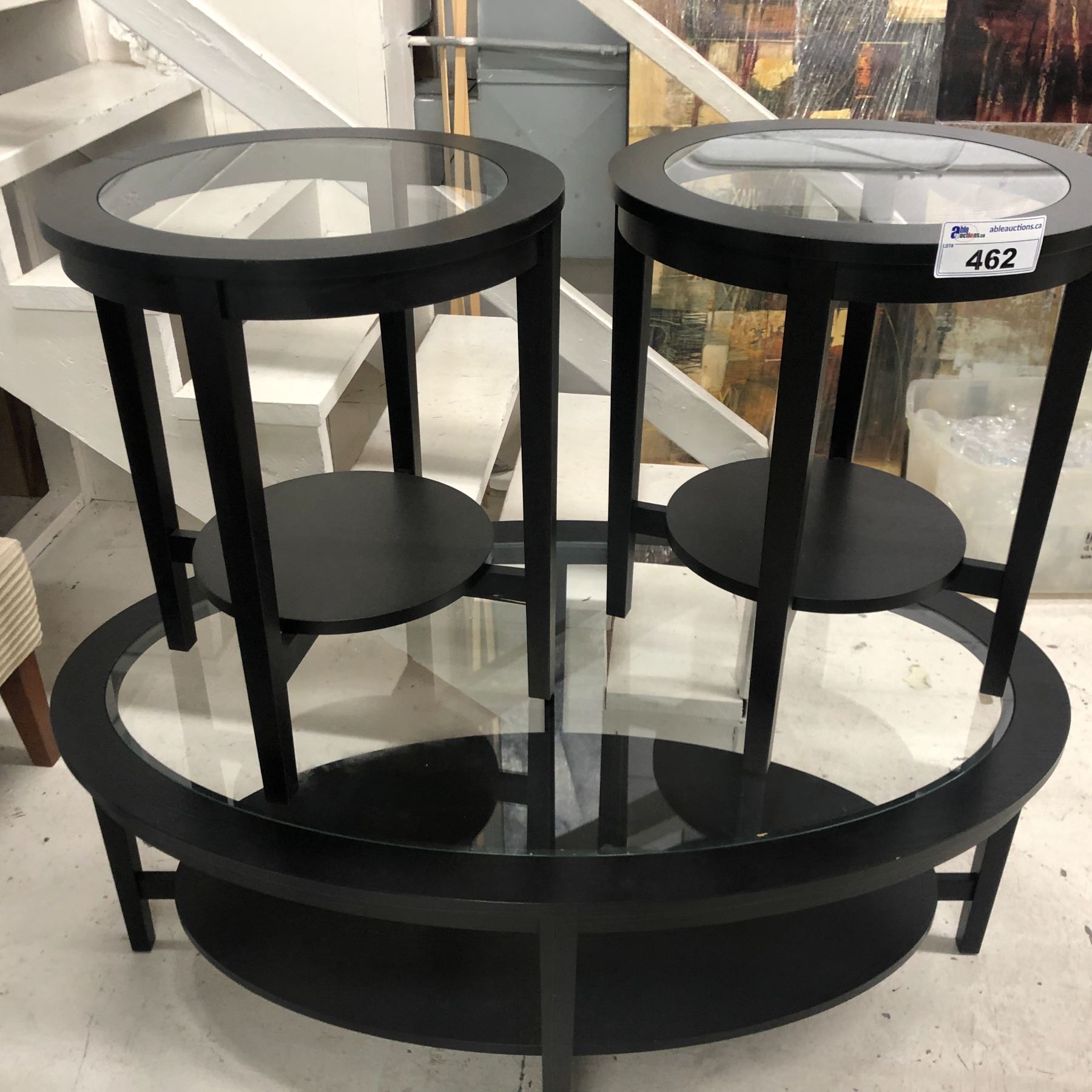 3 PIECE GLASS/MAHOGANY COFFEE TABLE SET