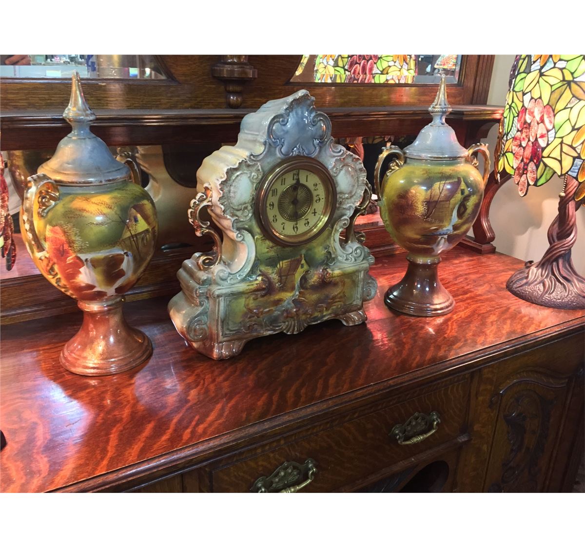 3 PIECE HAND PAINTED MANTLE CLOCK, SIGNED KENSON