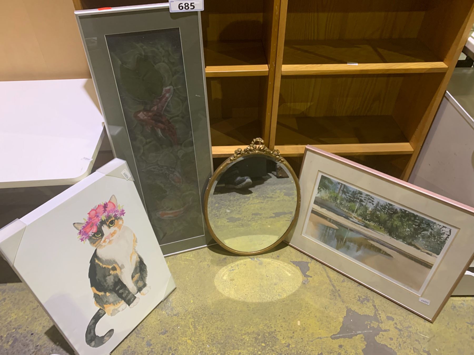 3 PIECES OF ASSORTED FRAMED ARTWORK & FRAMED MIRROR