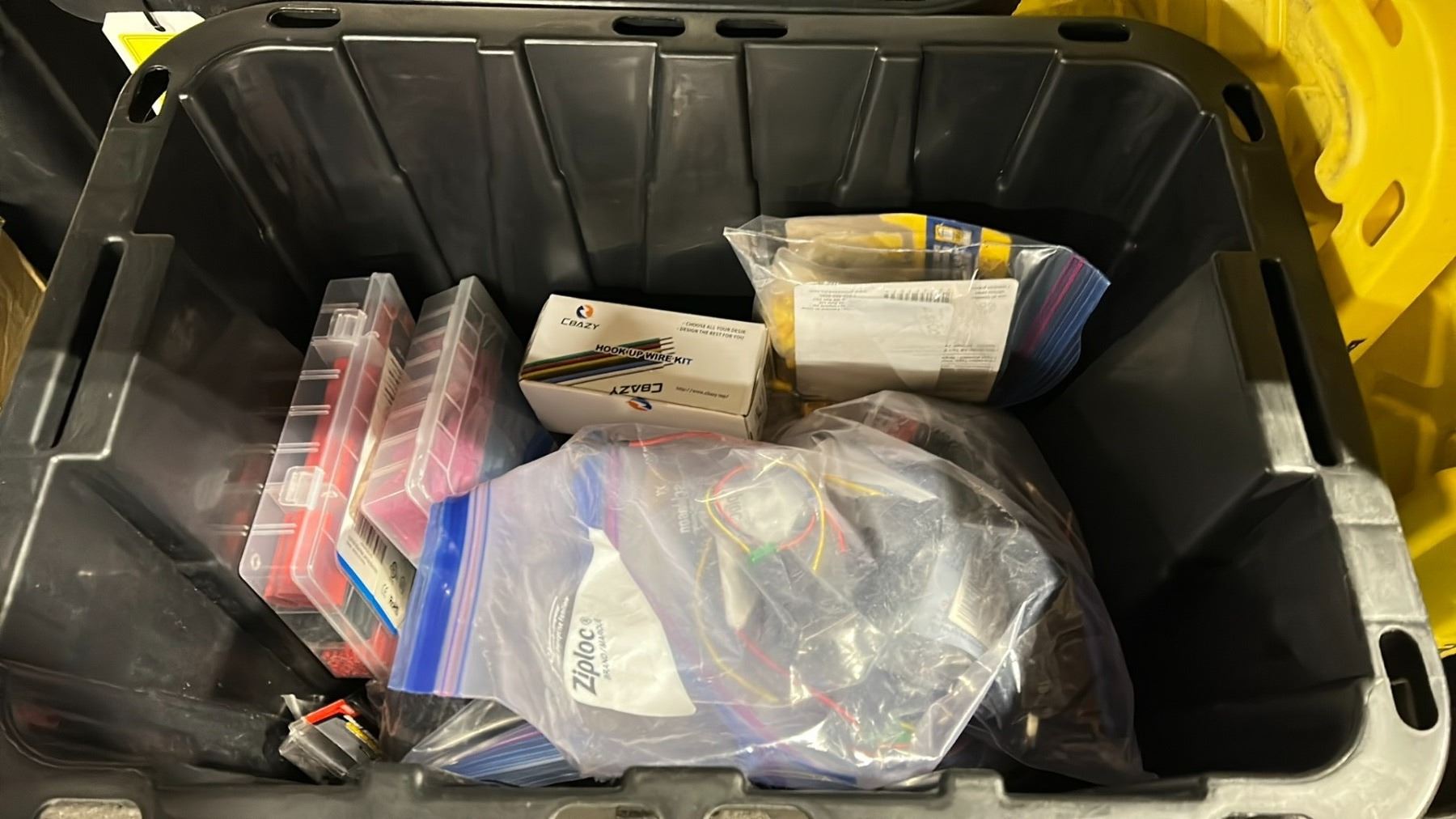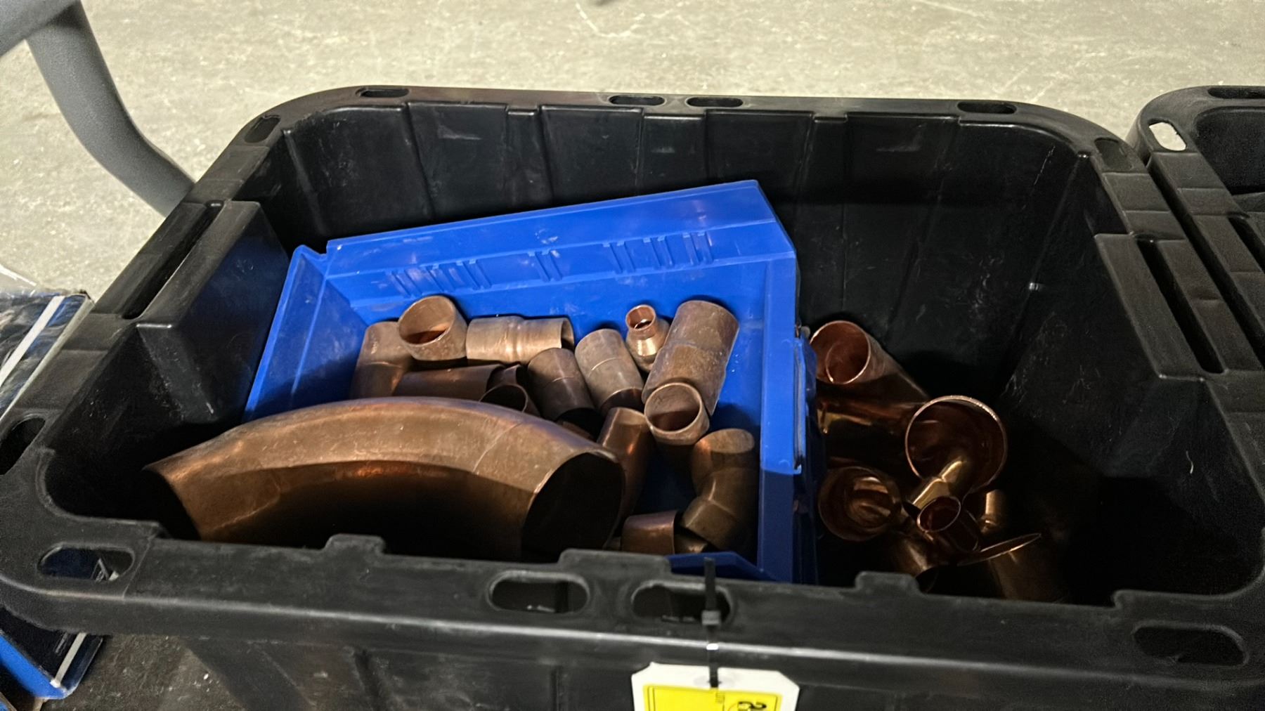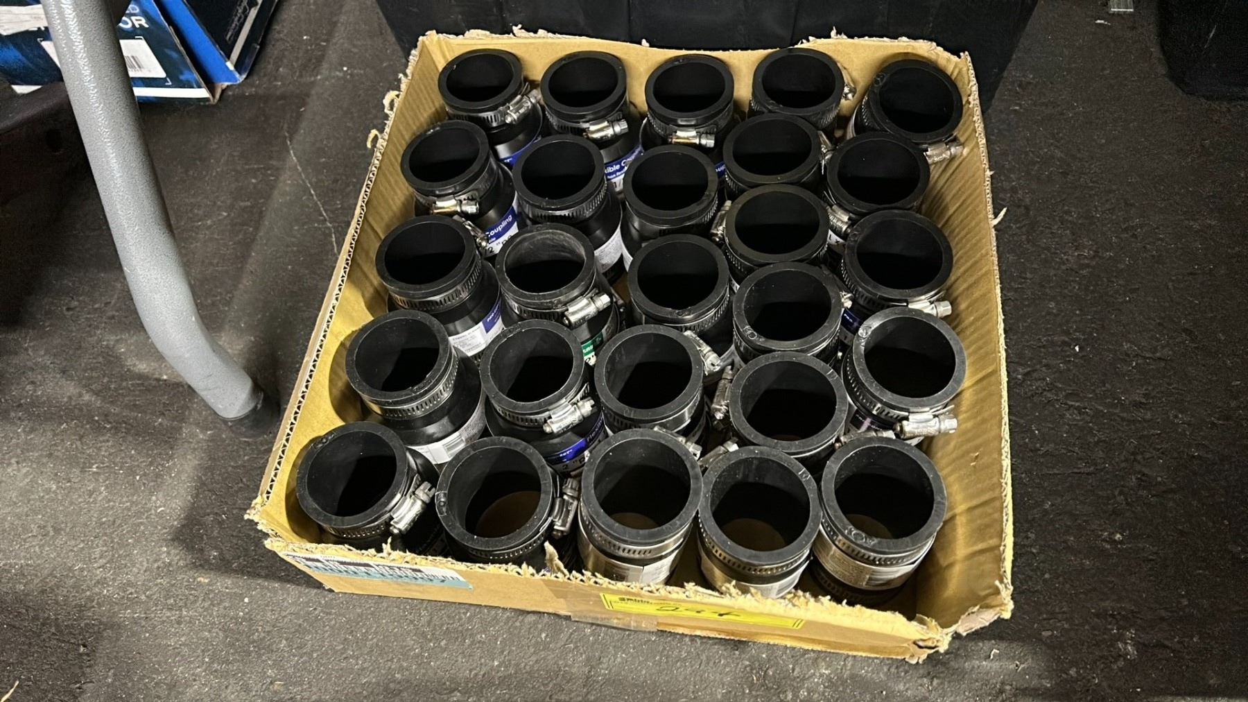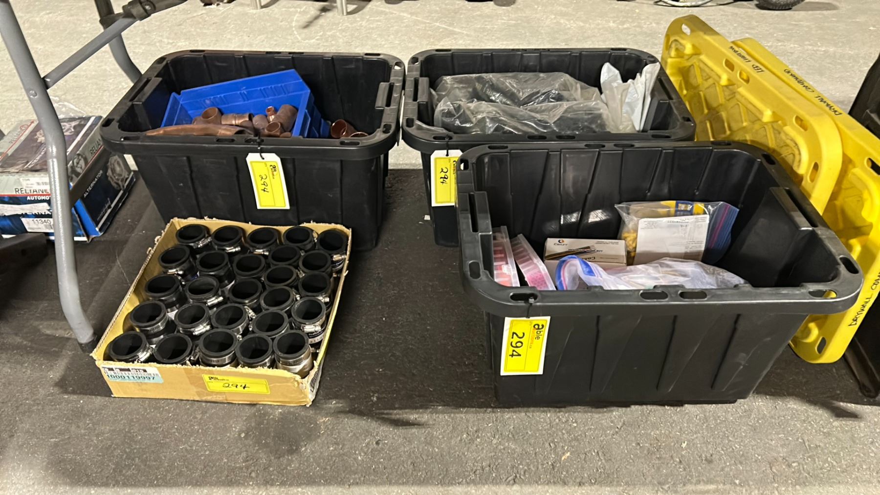 3 PLASTIC BINS OF ASSORTED COMMERCIAL PLUMBING / ELECTRICAL HARDWARE & BOX OF RUBBER PIPE CONNECTORS *PLASTIC BINS INCLUDED*