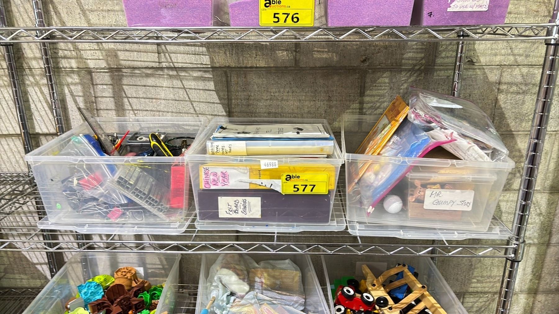 3 PLASTIC BINS OF OFFICE SUPPLIES, FELT BOARD STORY SUPPLIES & MORE
