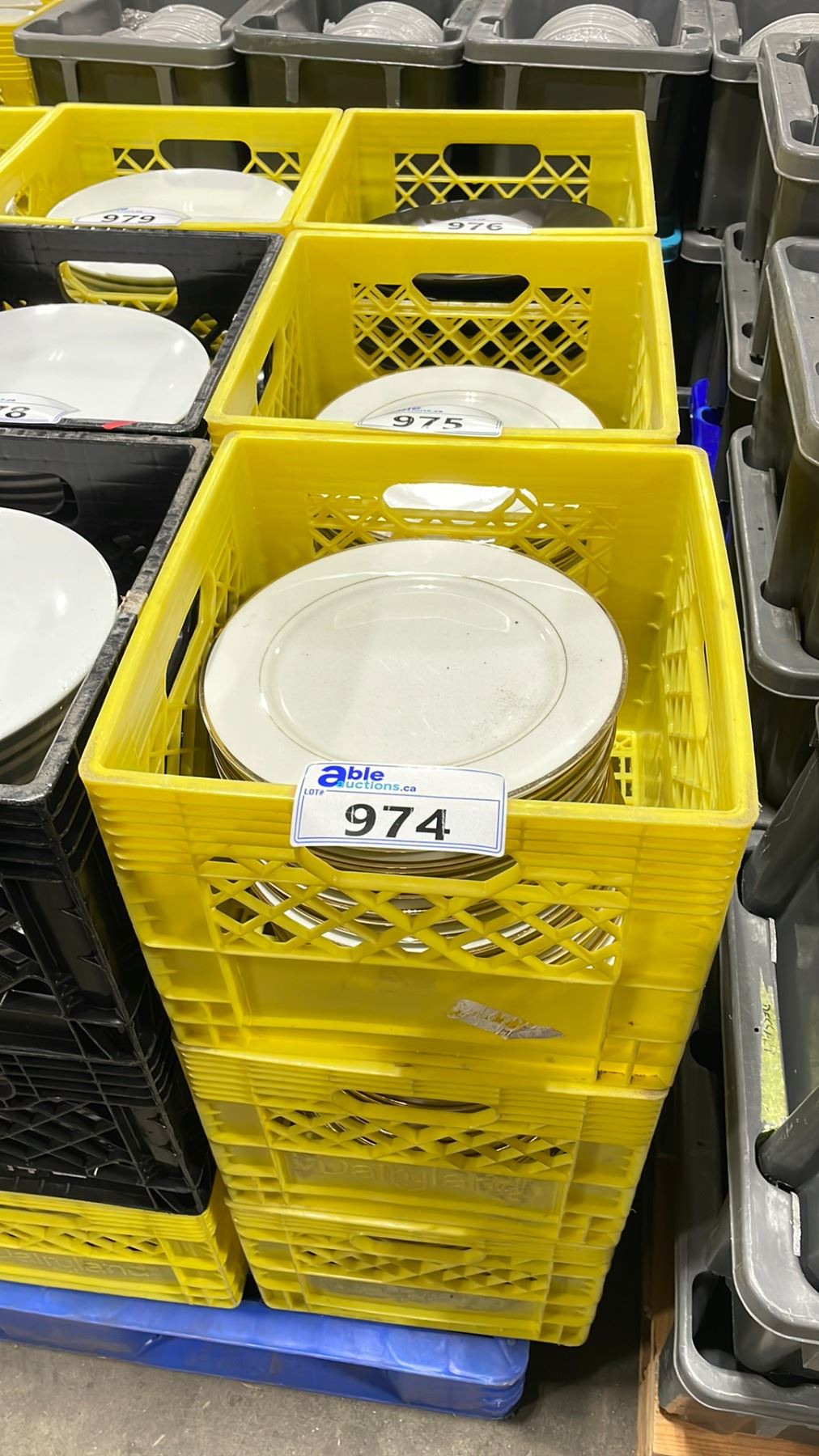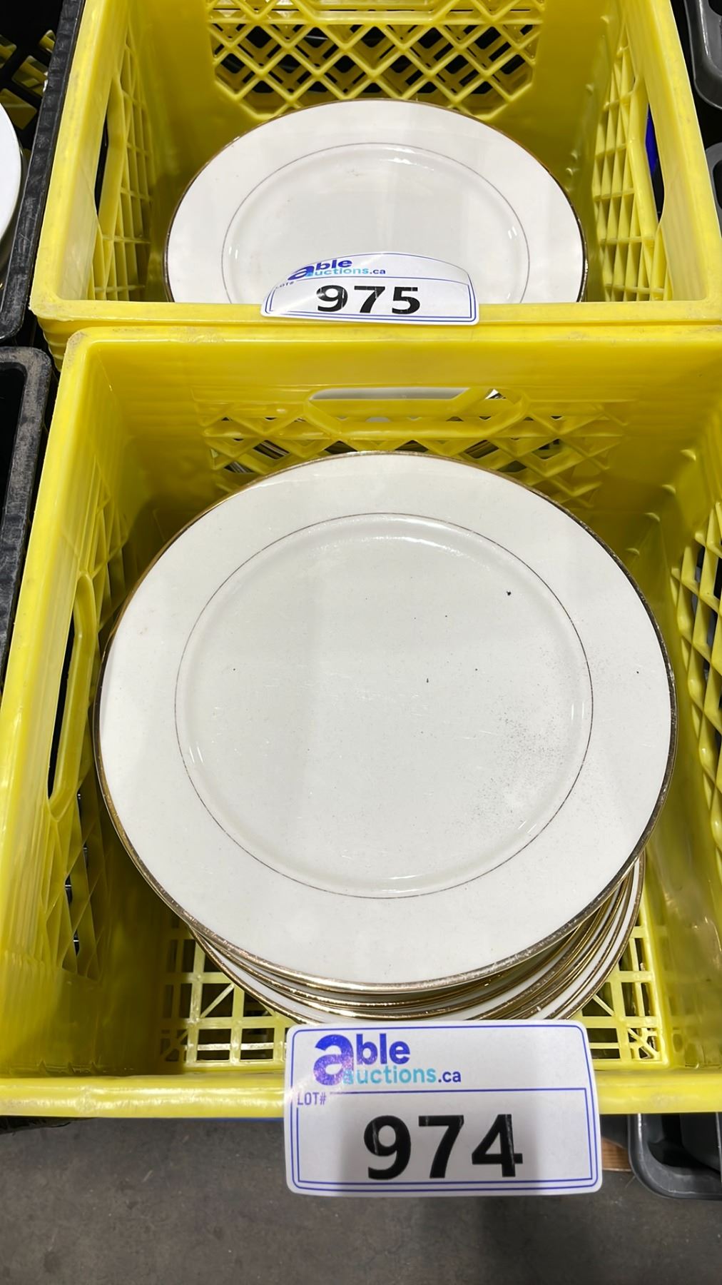 3 PLASTIC CRATES OF 10 1/2" WHITE COMMERCIAL RESTAURANT GOLD RIMED DINNER PLATES *PLASTIC CRATES INCLUDED* ( APPROX. 20 PLATES PER CRATE )
