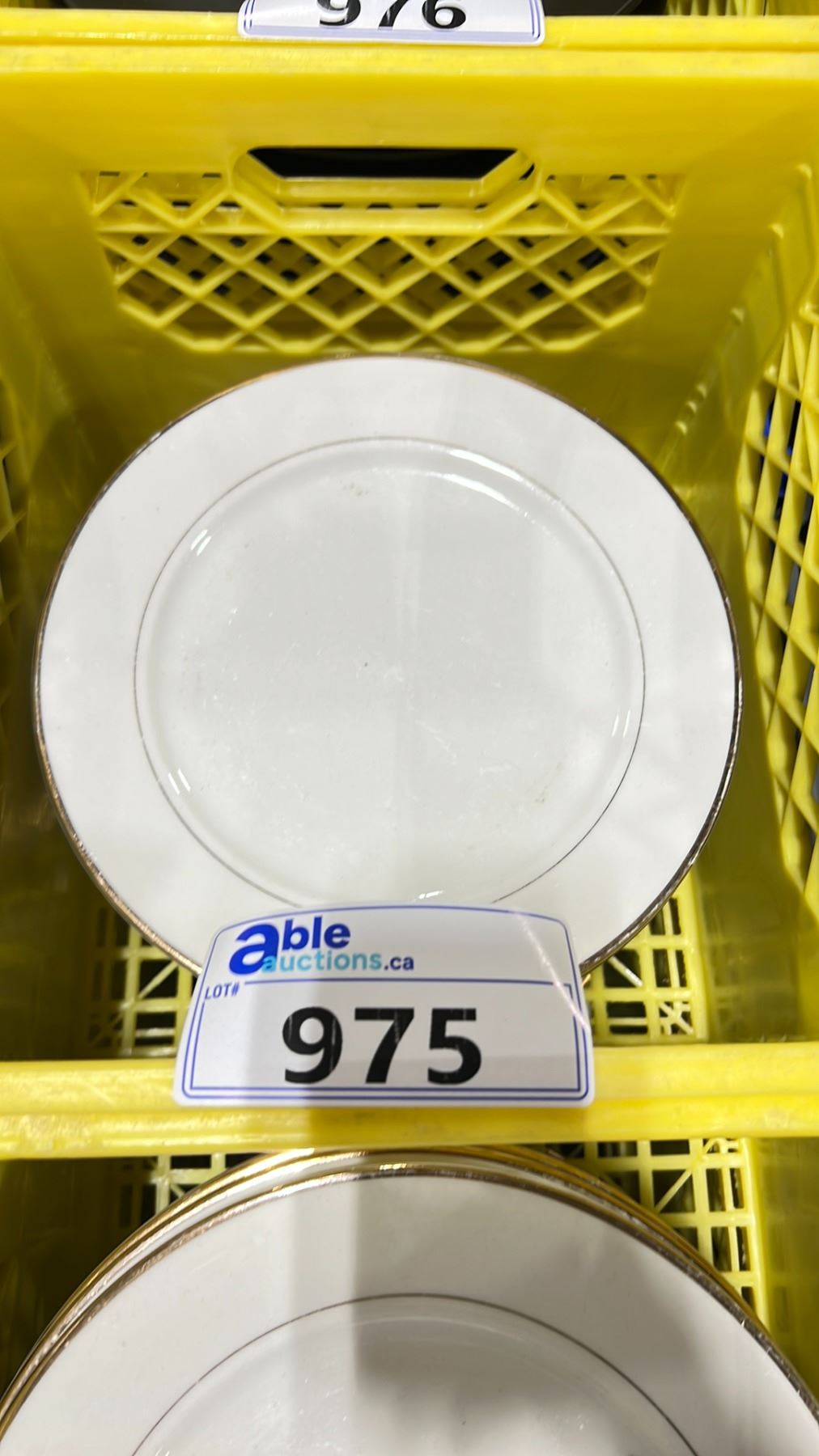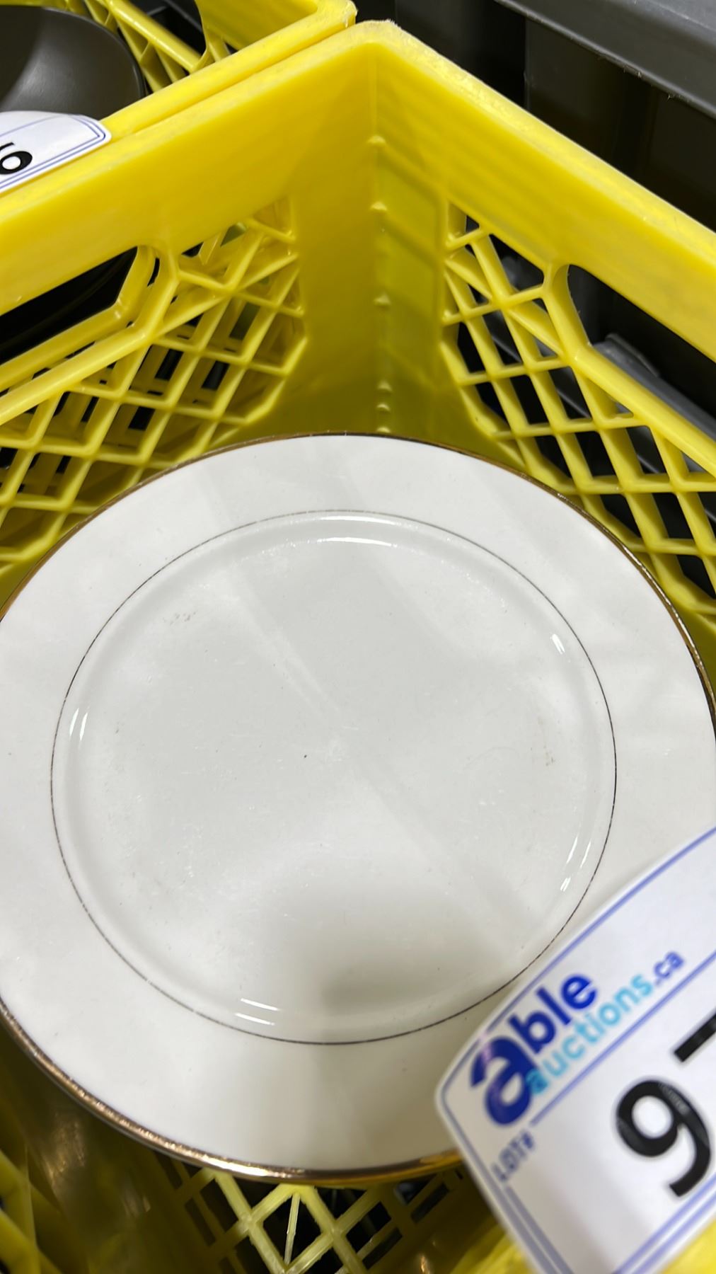 3 PLASTIC CRATES OF 10 1/2" WHITE COMMERCIAL RESTAURANT GOLD RIMED DINNER PLATES *PLASTIC CRATES INCLUDED* ( APPROX. 15 PLATES PER CRATE )