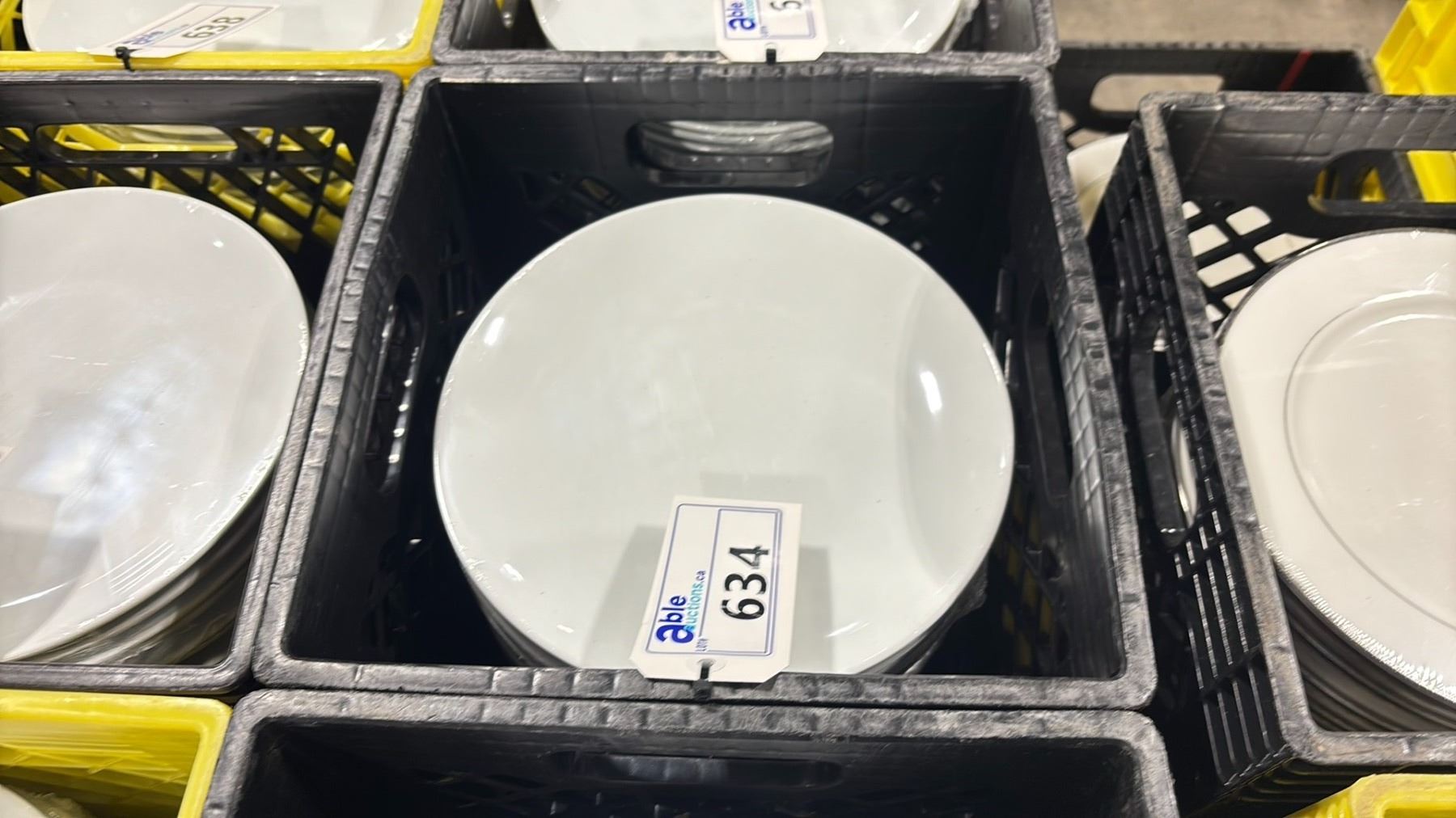 3 PLASTIC CRATES OF 11" ROUND COMMERCIAL RESTAURANT PORCELAIN DINNER PLATES *CRATES INCLUDED* ( APPROX. 15 PLATES PER CRATE )
