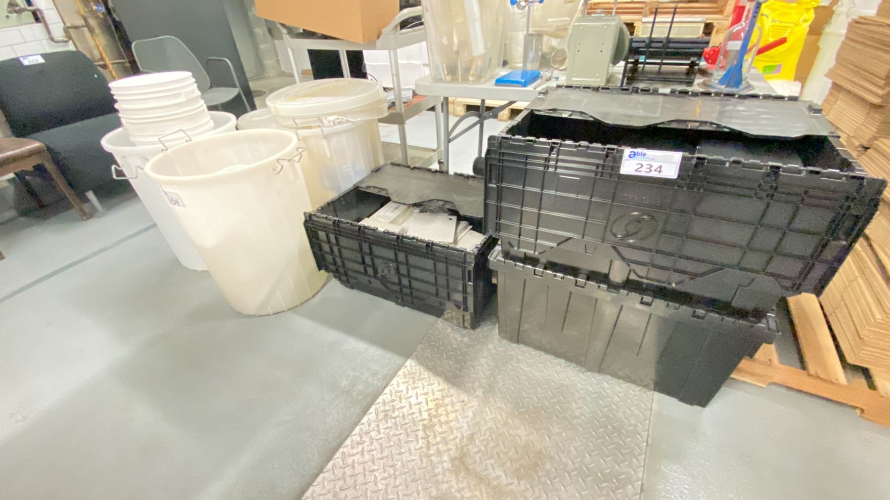 3 PLASTIC STORAGE BINS OF ASSORTED CARBON FILTERS, BELCO FILTERS, SYNTHETIC STOPPERS, & ASSORTED PLASTIC STORAGE CONTAINERS / BUCKETS *ALL CONTAINERS / BINS INCLUDED* *FIRST DAY REMOVAL*