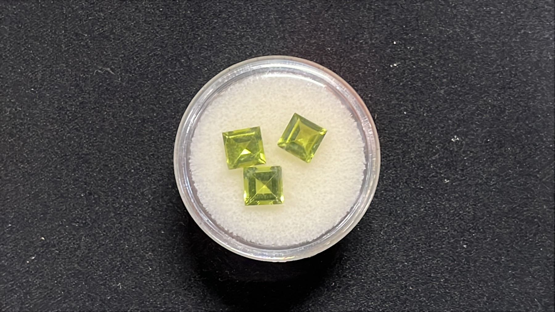 (3) PRINCESS CUT PERIDOT GEMSTONES: EACH IS 6MM X 6MM