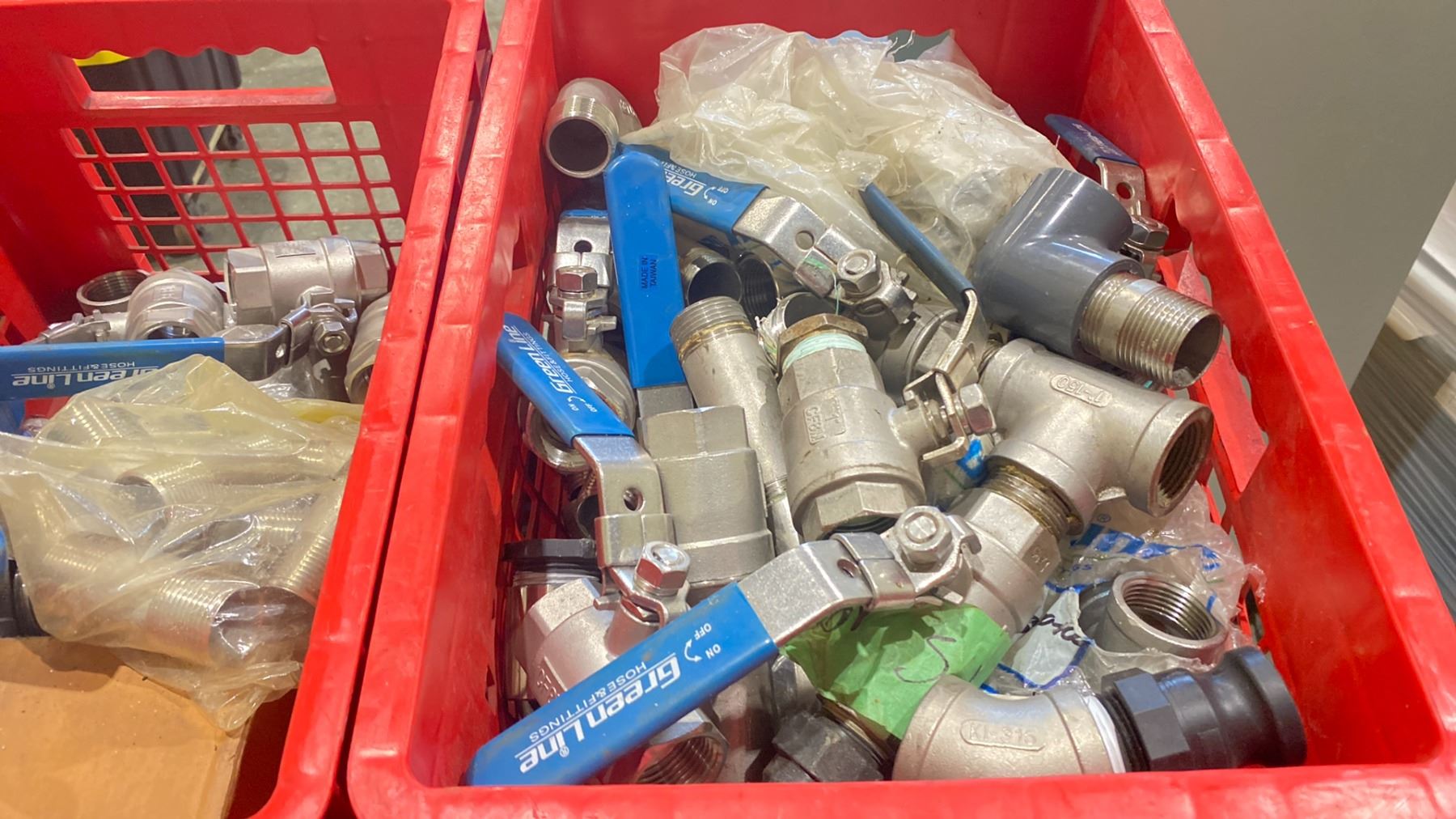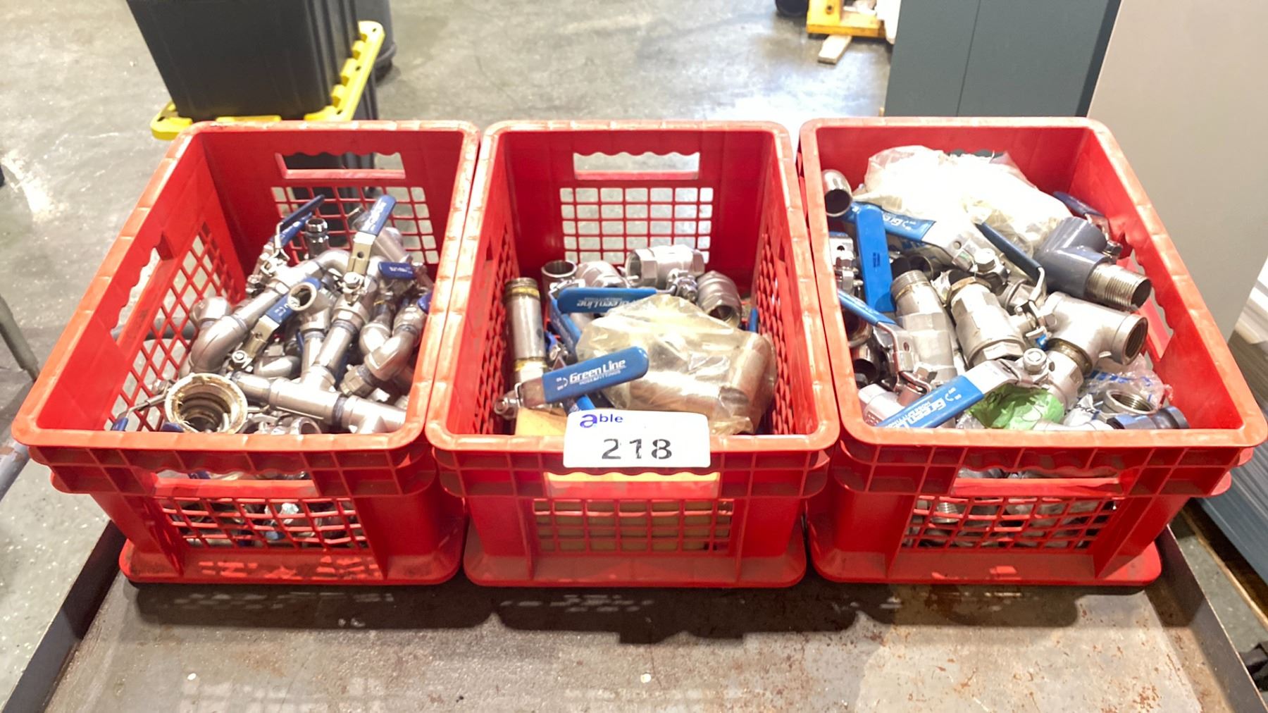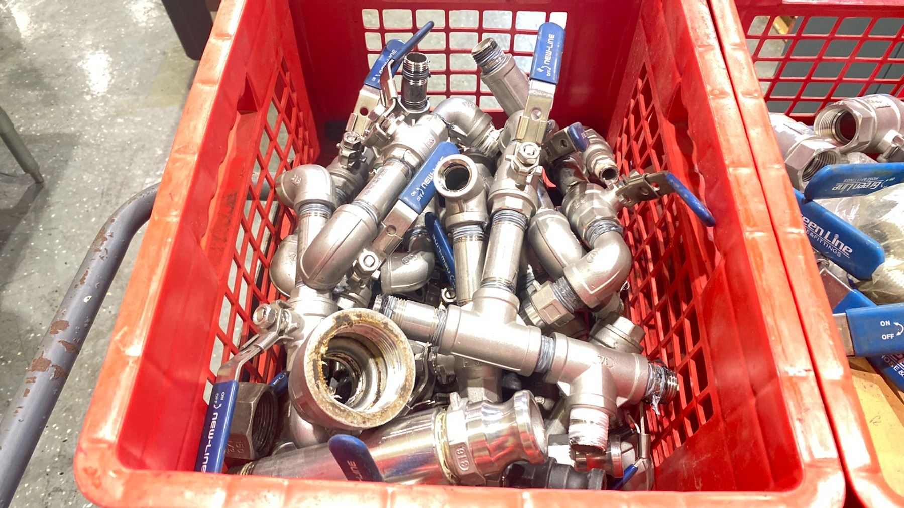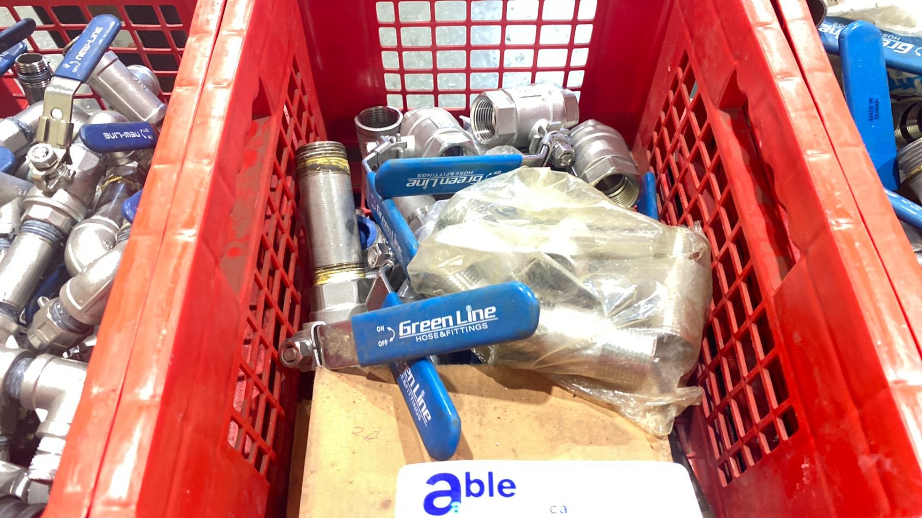 3 RED CRATES OF ASSORTED 1" BALL VALVES & THREADED FITTINGS -APPROX. 60 VALVES