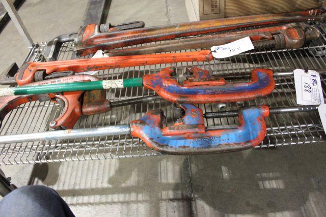 3 RIDGID HEAVY DUTY PIPE CUTTERS & 3 LARGE PIPE WRENCHES