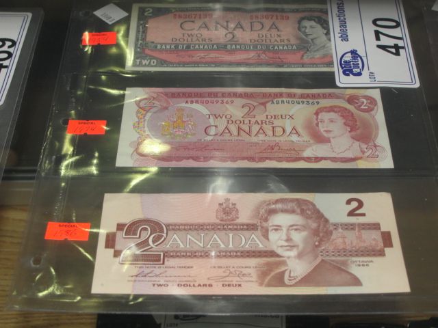 3 ROYAL CANADIAN MINT $2 BANK NOTES 1954, 1974, 1986