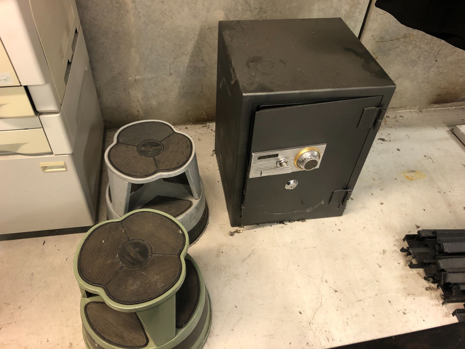 3 SAFES (NO COMBO OR KEYS) SMALL DESK, 3 STEP STOOLS AND RICOH AFICIO CL4000DN NETWORK PRINTER