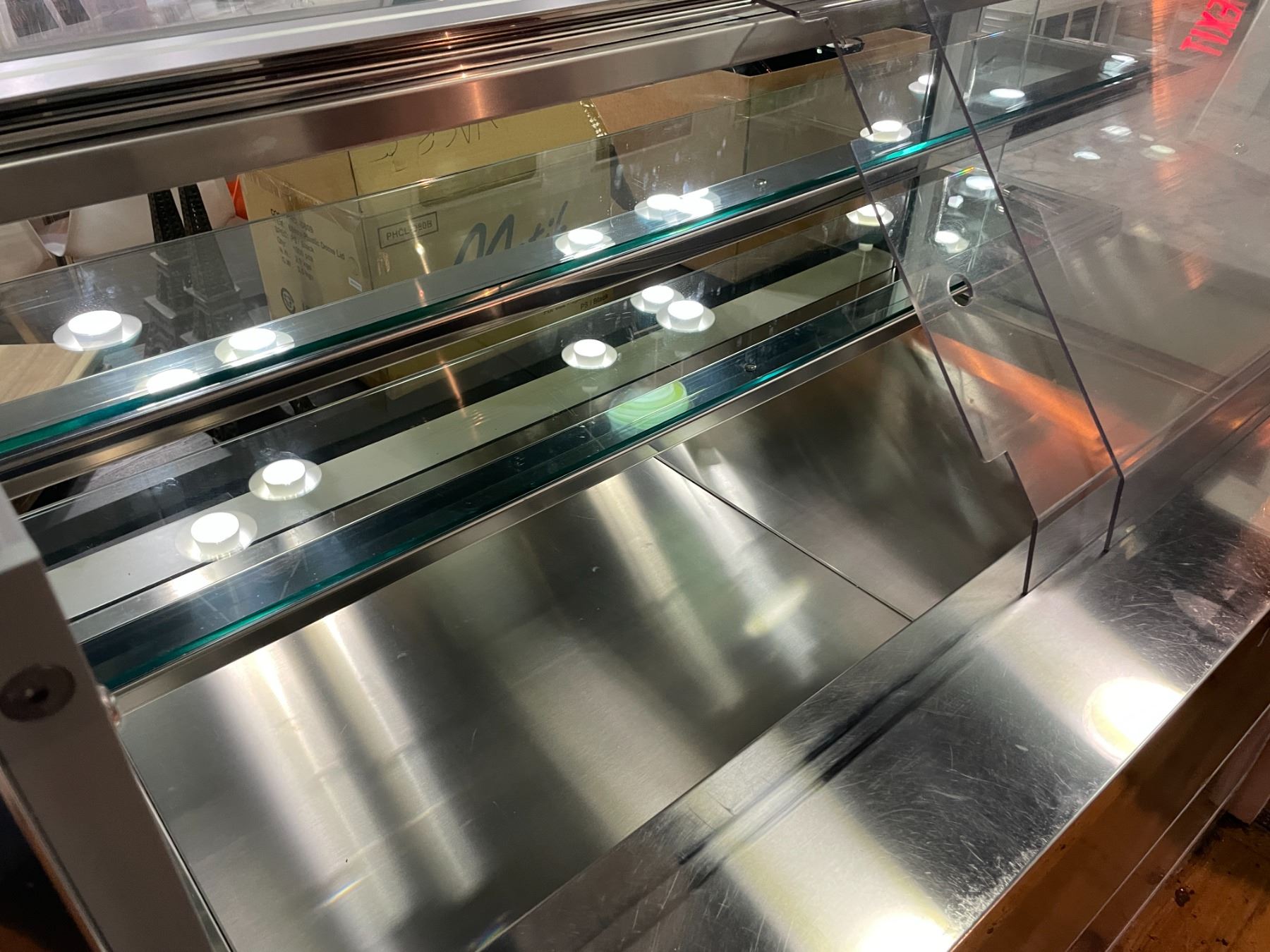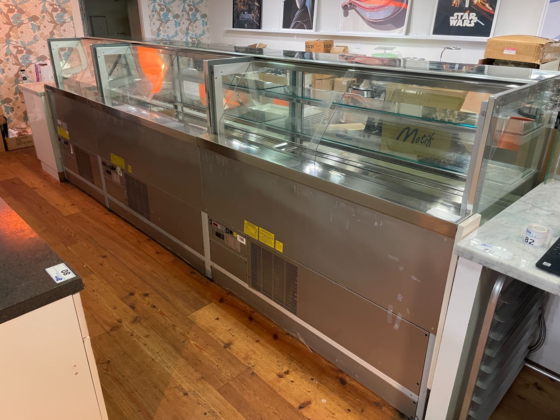 3 SECTION LA ROSSA RVS H60/136/15 STAINLESS STEEL 3 TIER COOLED COMMERCIAL PASTRY DISPLAY CASE WITH WHITE FRONT ( CAN DISMANTLE TO 3 STAND ALONE SECTIONS )