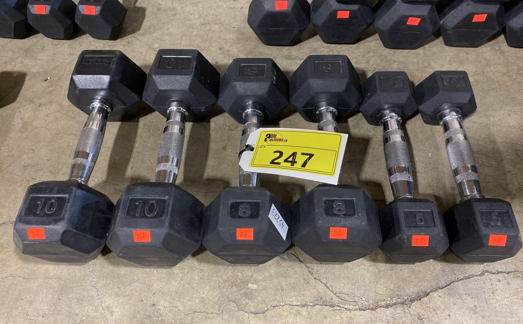 3 SETS OF COMMERCIAL RUBBER COATED DUMB BELLS *10, 8, 5 LBS*