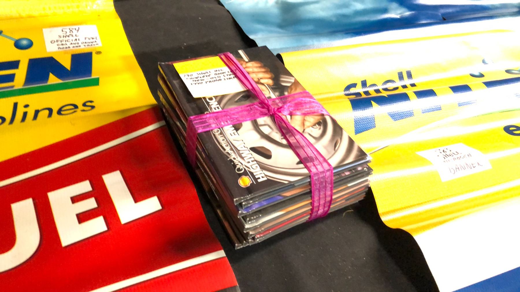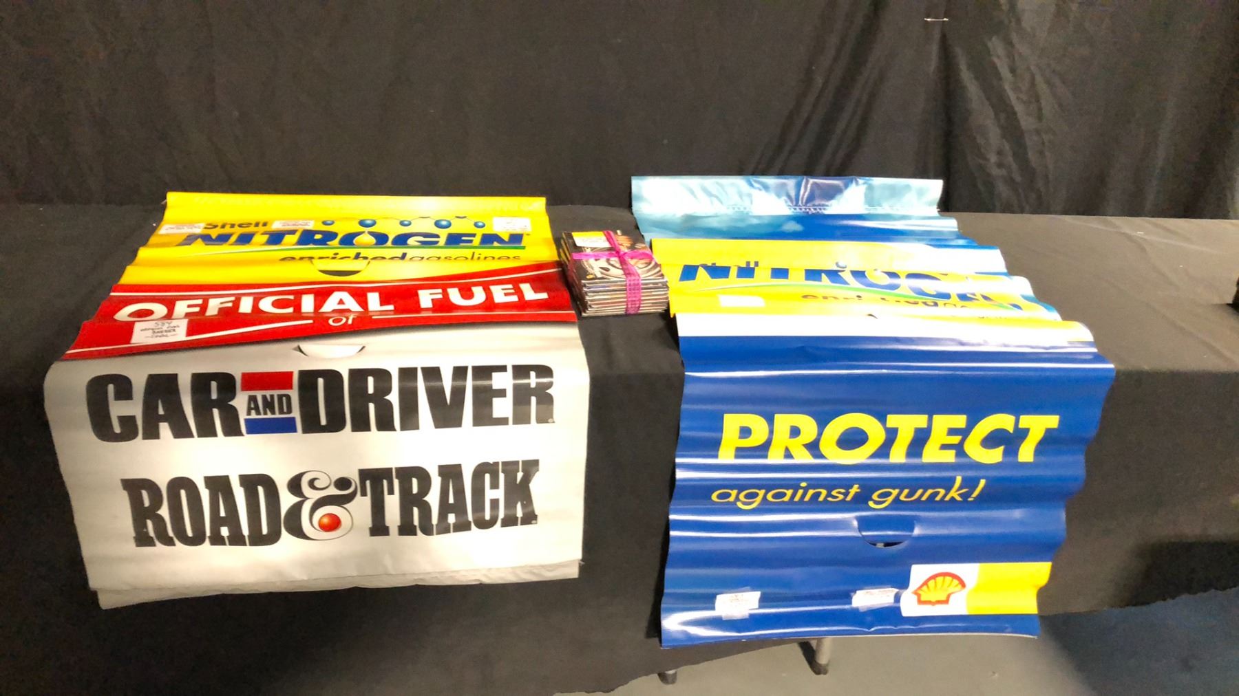 3 SHELL BANNERS AND PROMO STOCK BOOK SET (NEW-OLD STOCK) INCL W60" X H30" DOUBLE-SIDED