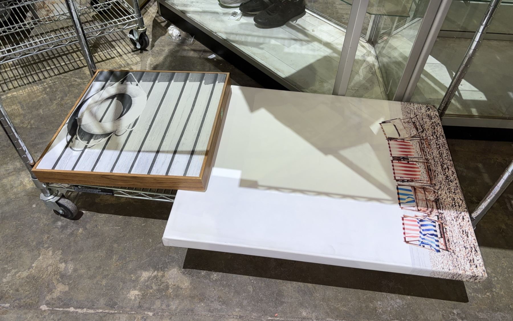 3 SHELVES OF ASSORTED ART INCLUDING; BOAT ART, BEACH PICTURES AND MORE